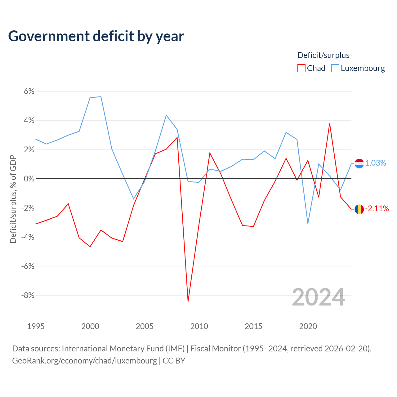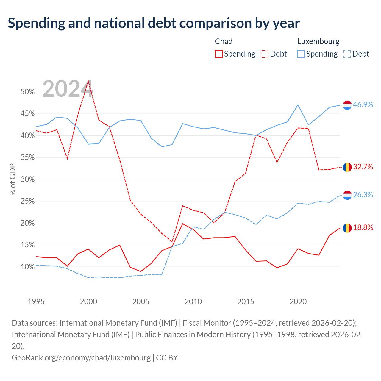 Chad has $6.37B in government debt (32.7% of GDP), compared to $24.5B (26.3% of GDP) in Luxembourg.