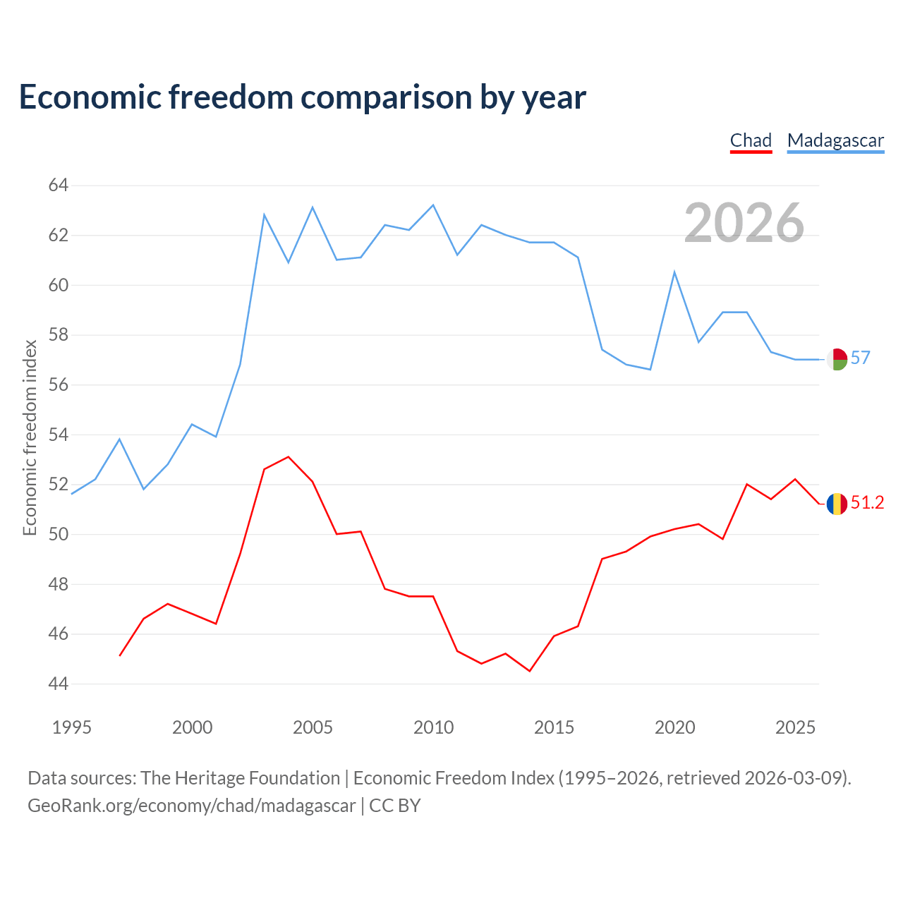 The Economic Freedom Index for Chad is 51.2, ranking 154/197, compared to 57 for Madagascar, ranking 119/197. The chart above displays a comparison of annual changes in economic freedom indexes.