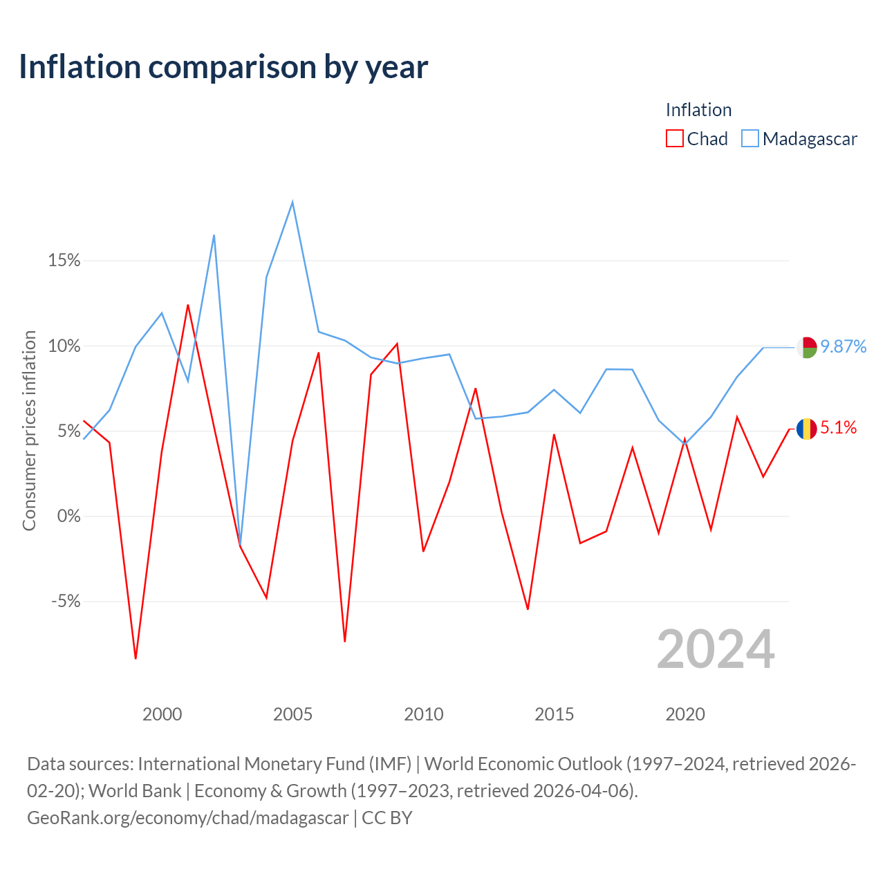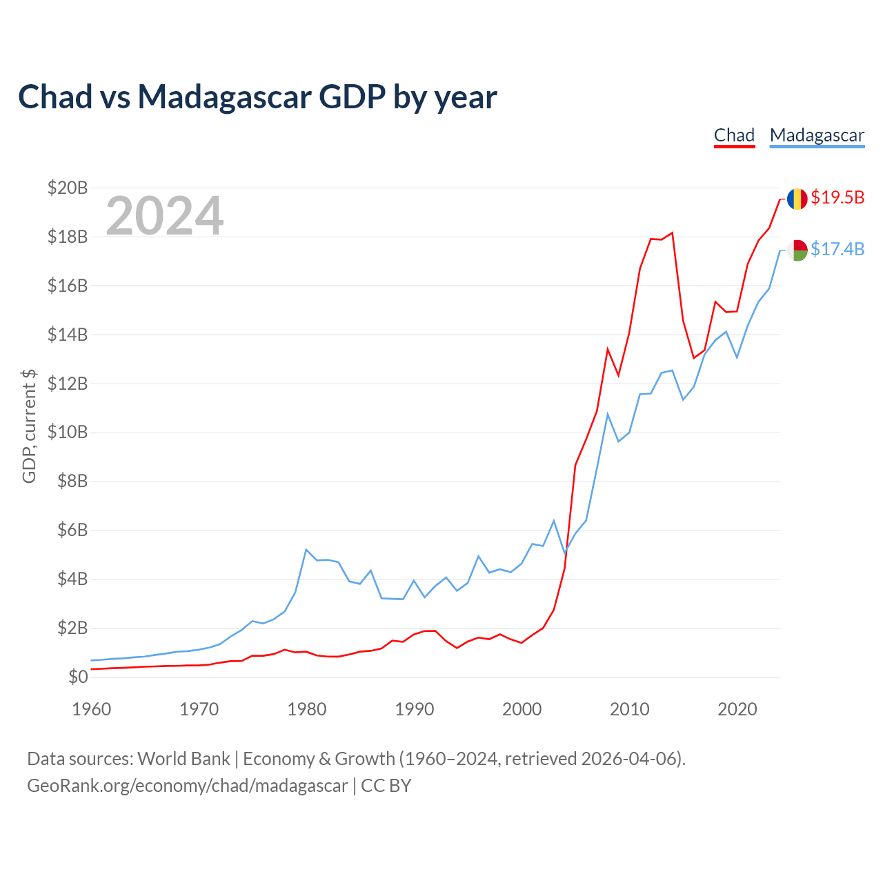 Chad has a GDP of $19.5B compared to $17.4B for Madagascar, ranking 132/197 and 136/197 by economy size, respectively.