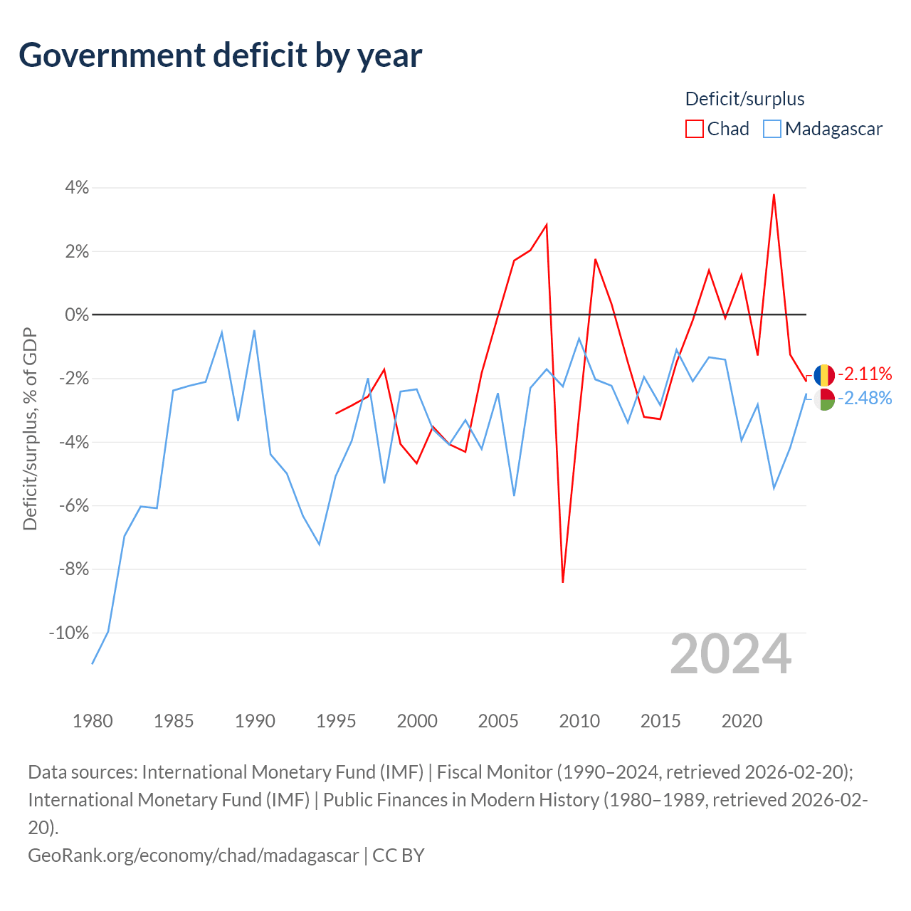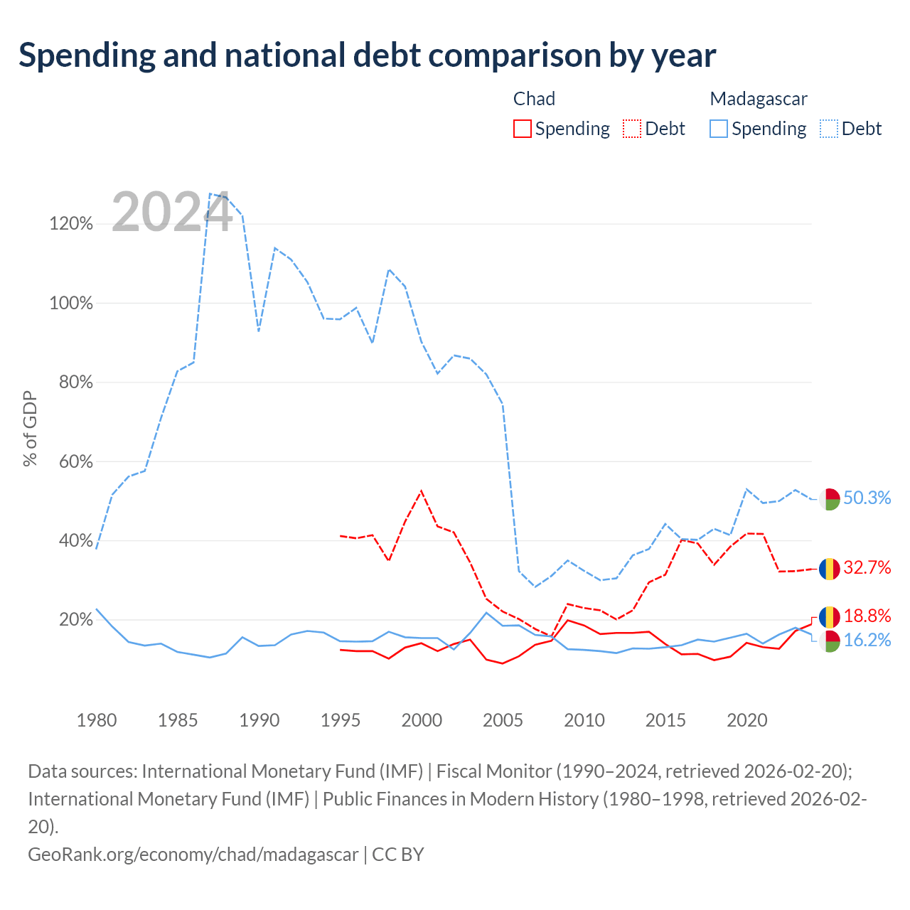 Chad has $6.37B in government debt (32.7% of GDP), compared to $8.77B (50.3% of GDP) in Madagascar.