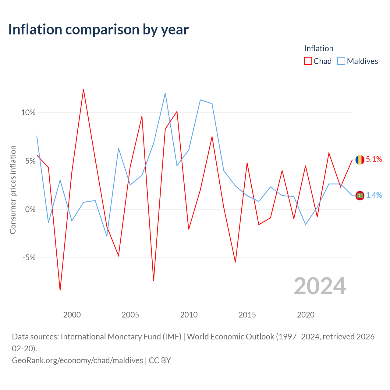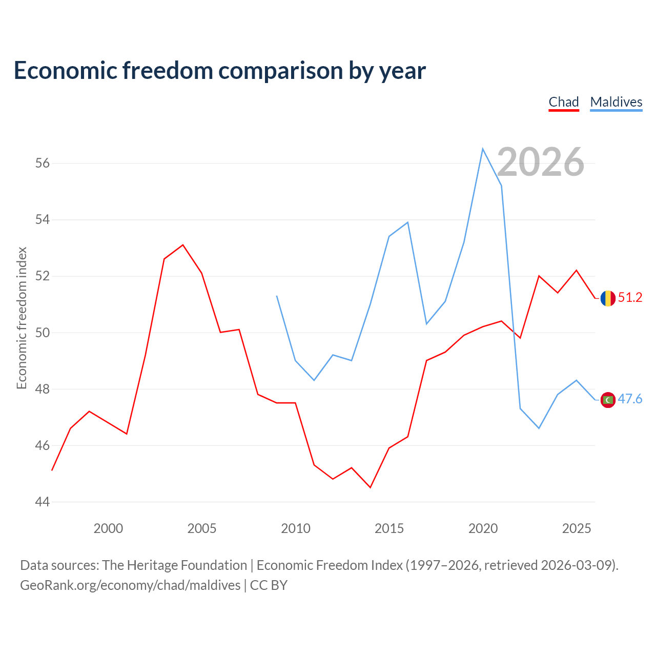 The Economic Freedom Index for Chad is 51.2, ranking 154/197, compared to 47.6 for Maldives, ranking 174/197. The chart above displays a comparison of annual changes in economic freedom indexes.