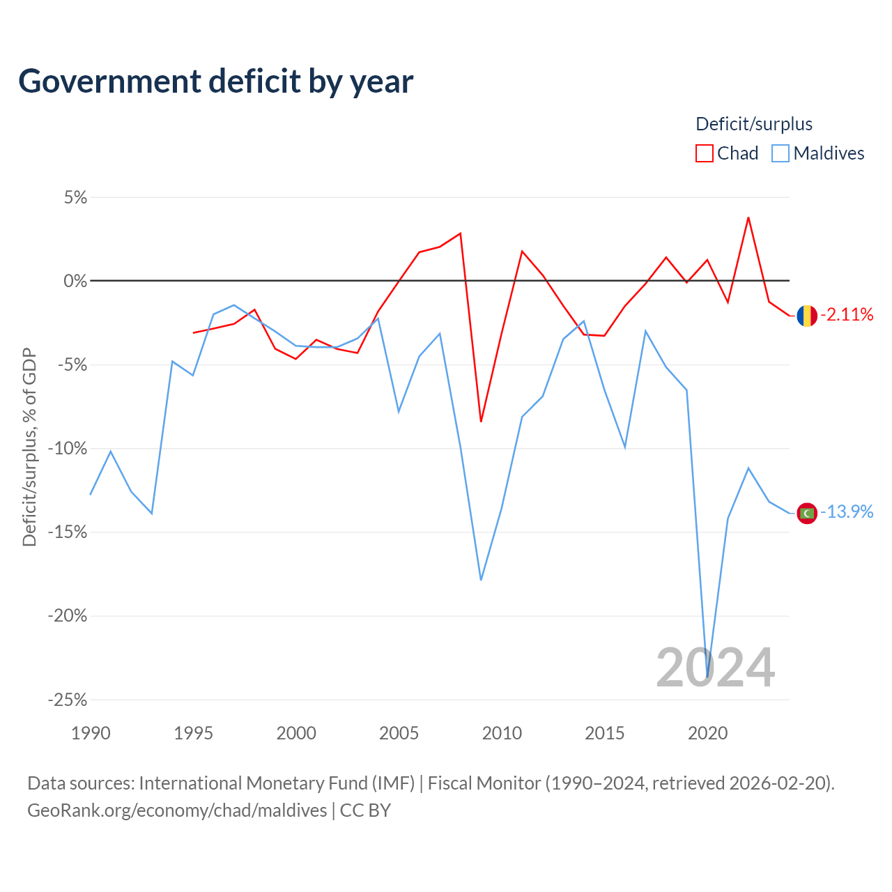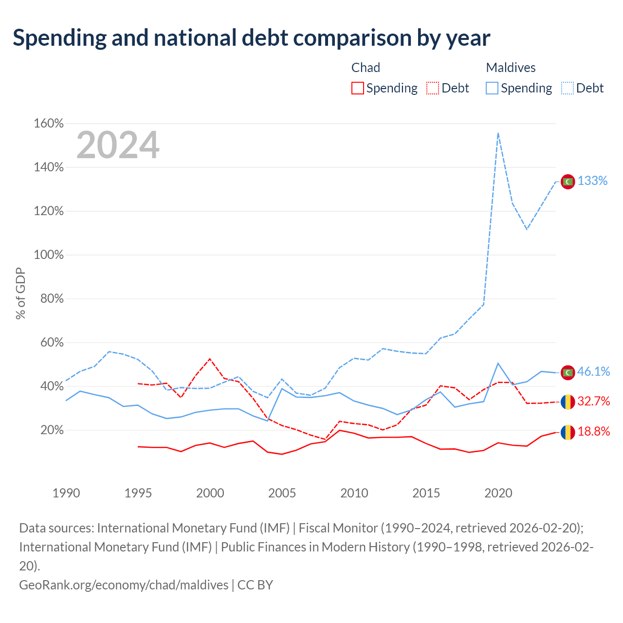 Chad has $6.37B in government debt (32.7% of GDP), compared to $9.41B (133.3% of GDP) in Maldives.