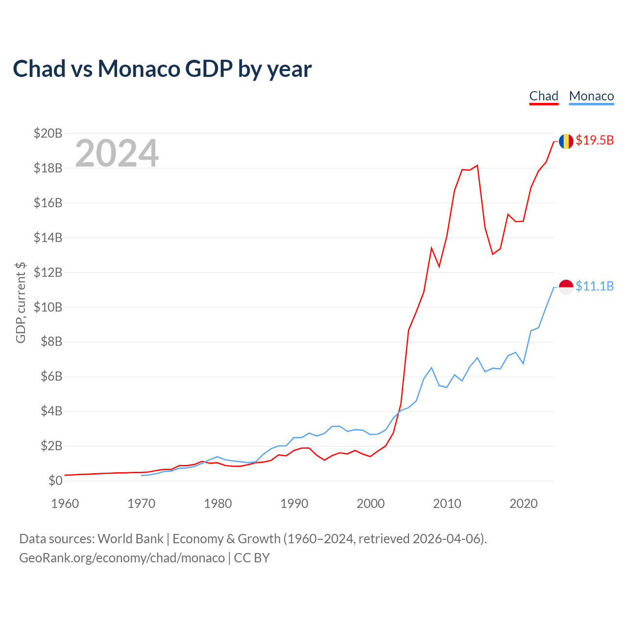 Chad has a GDP of $19.5B compared to $11.1B for Monaco, ranking 132/197 and 152/197 by economy size, respectively.