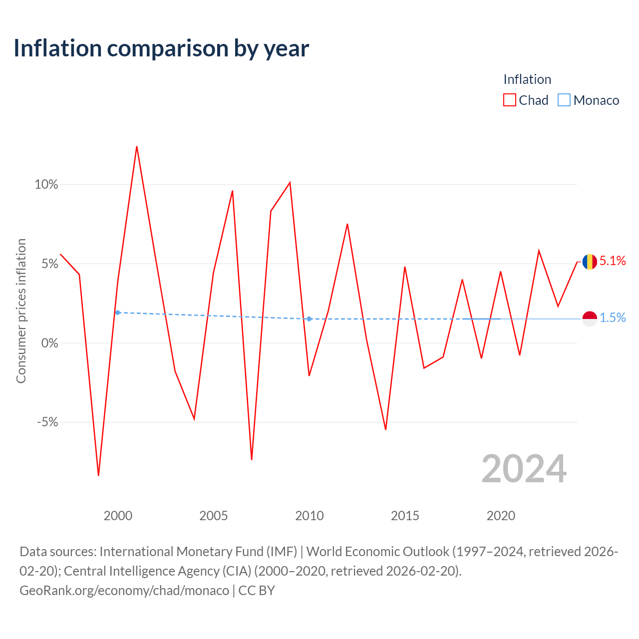 Over the past 21 years, Chad has recorded an average annual inflation rate of 2.46%, compared with 1.58% in Monaco. In 2020, inflation was 5.1% in Chad and 1.5% in Monaco.