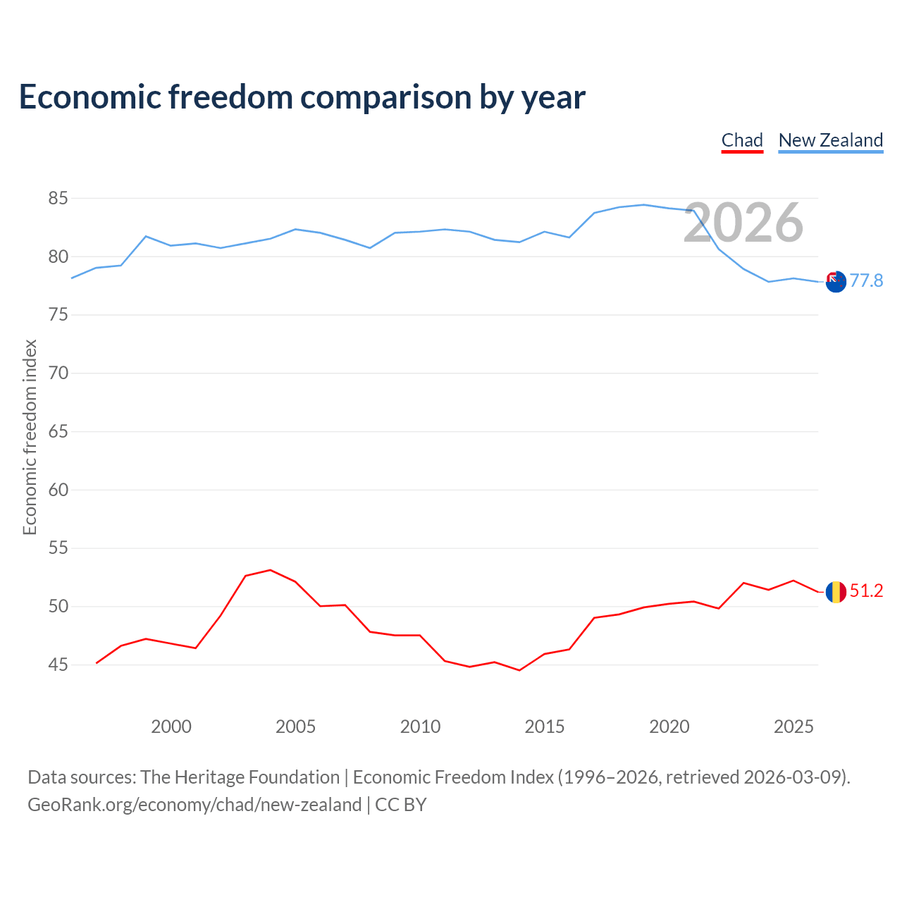 The Economic Freedom Index for Chad is 51.2, ranking 154/197, compared to 77.8 for New Zealand, ranking 13/197. The chart above displays a comparison of annual changes in economic freedom indexes.