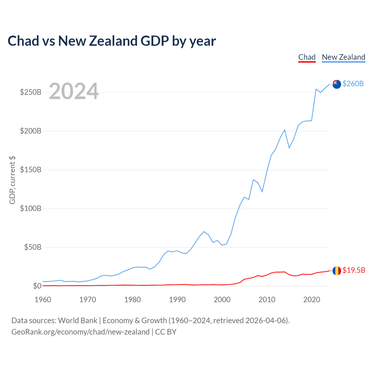 Chad has a GDP of $19.5B compared to $260B for New Zealand, ranking 132/197 and 52/197 by economy size, respectively.