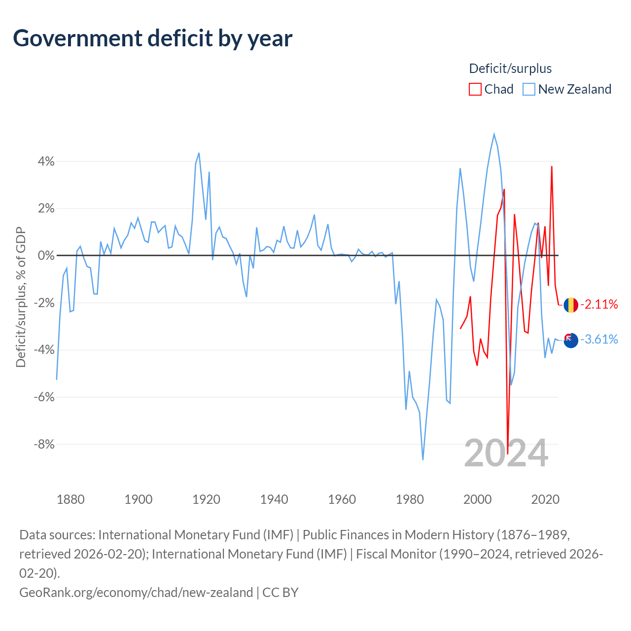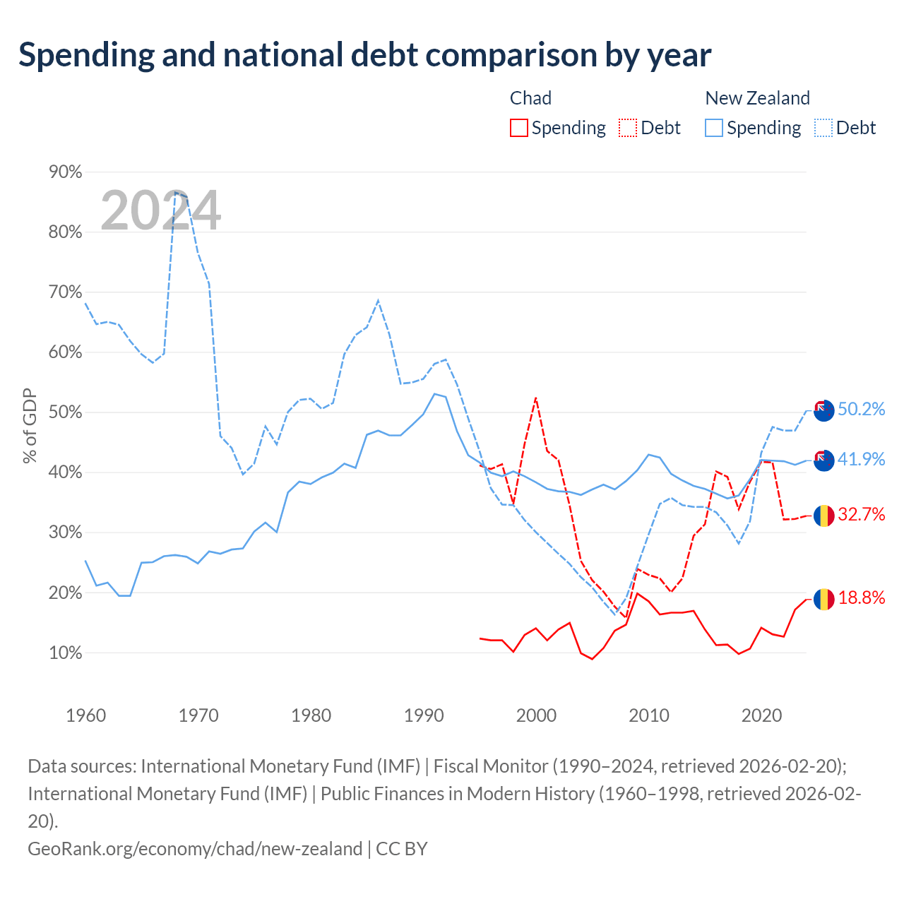 Chad has $6.37B in government debt (32.7% of GDP), compared to $131B (50.2% of GDP) in New Zealand.