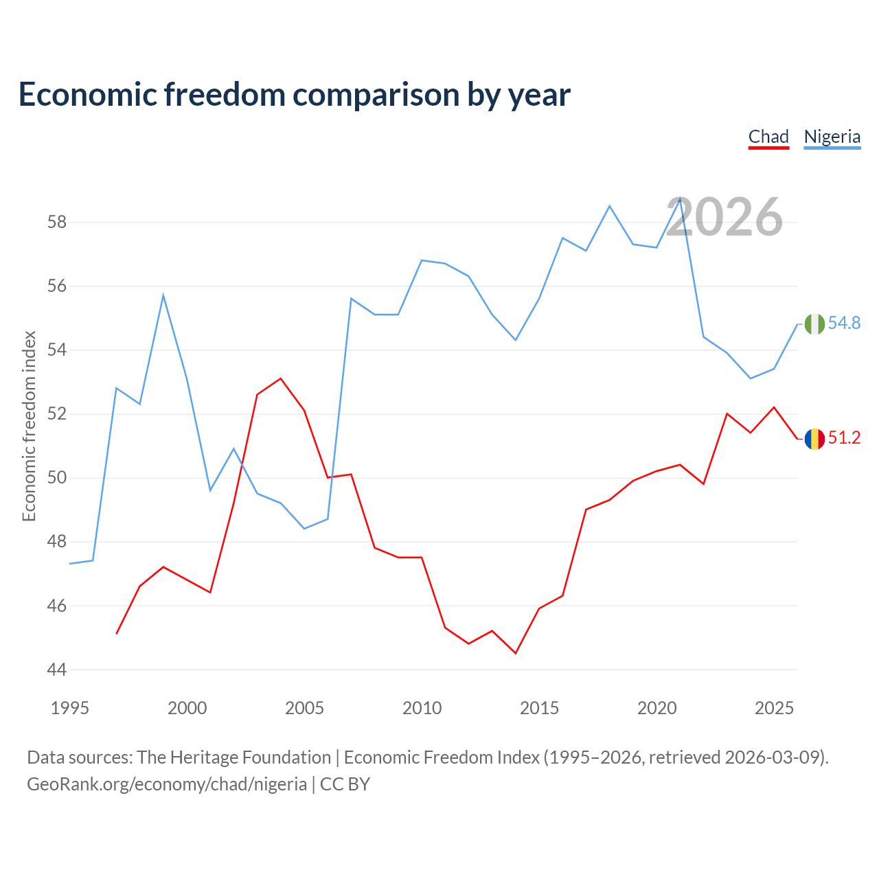 The Economic Freedom Index for Chad is 51.2, ranking 154/197, compared to 54.8 for Nigeria, ranking 132/197. The chart above displays a comparison of annual changes in economic freedom indexes.
