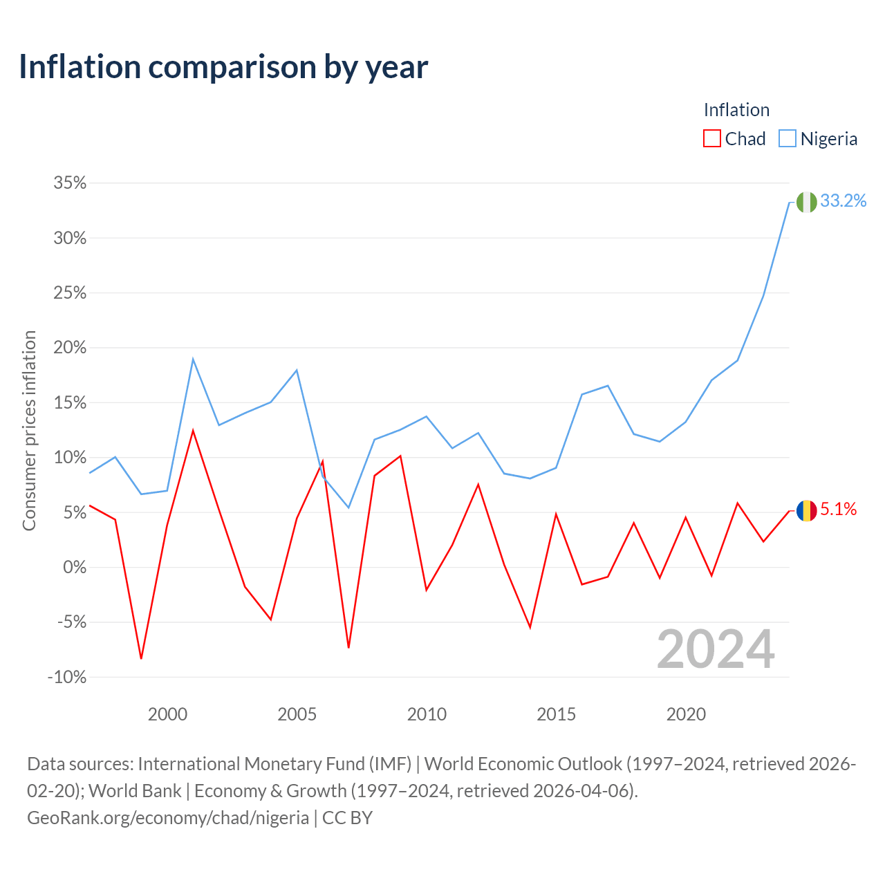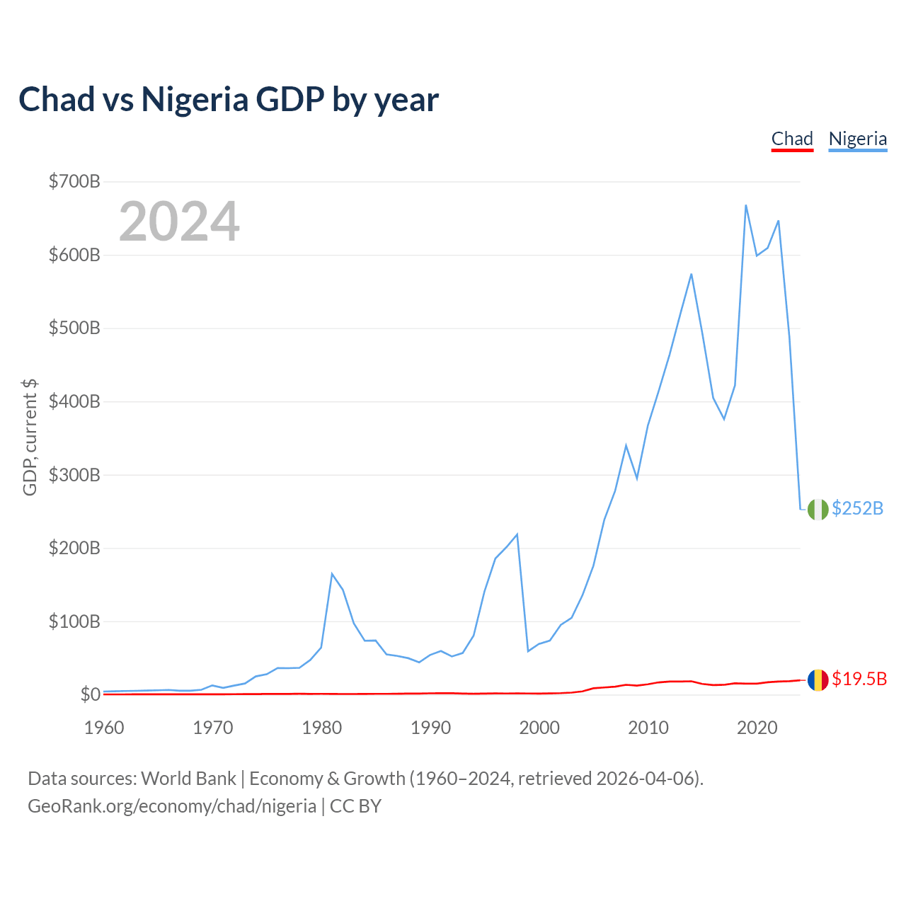 Chad has a GDP of $19.5B compared to $252B for Nigeria, ranking 132/197 and 54/197 by economy size, respectively.
