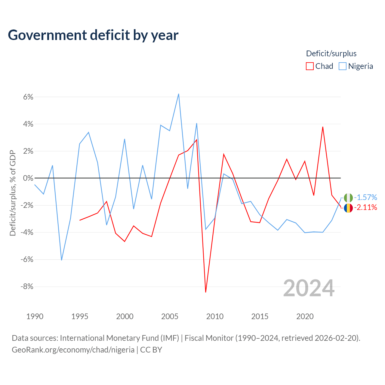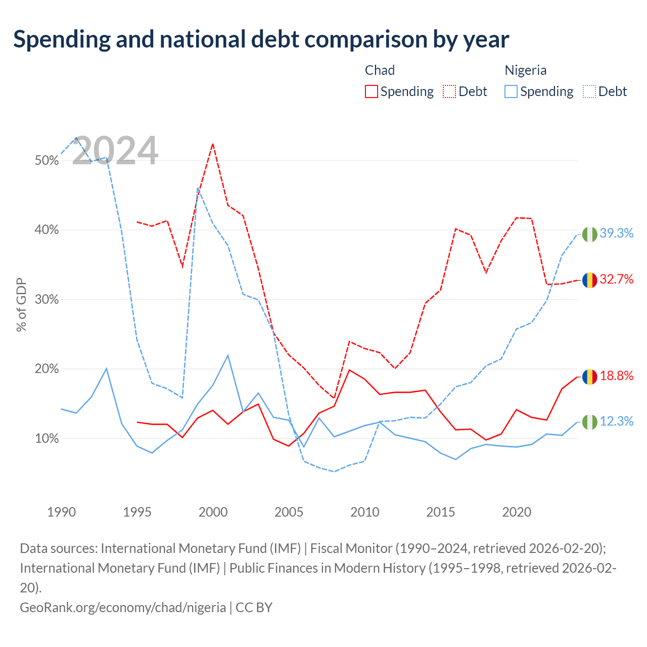 Chad has $6.37B in government debt (32.7% of GDP), compared to $99.2B (39.3% of GDP) in Nigeria.