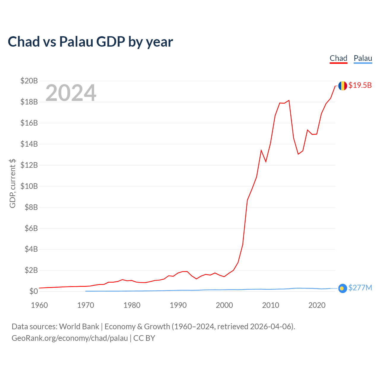 Chad has a GDP of $19.5B compared to $277M for Palau, ranking 132/197 and 194/197 by economy size, respectively.