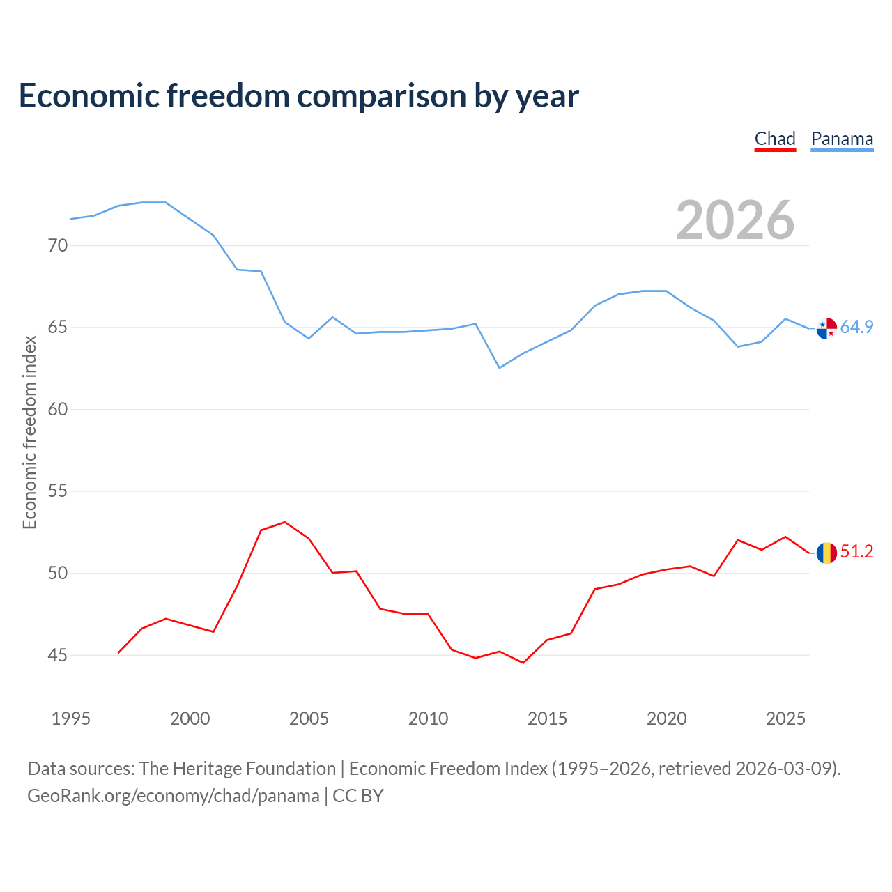 The Economic Freedom Index for Chad is 51.2, ranking 154/197, compared to 64.9 for Panama, ranking 70/197. The chart above displays a comparison of annual changes in economic freedom indexes.