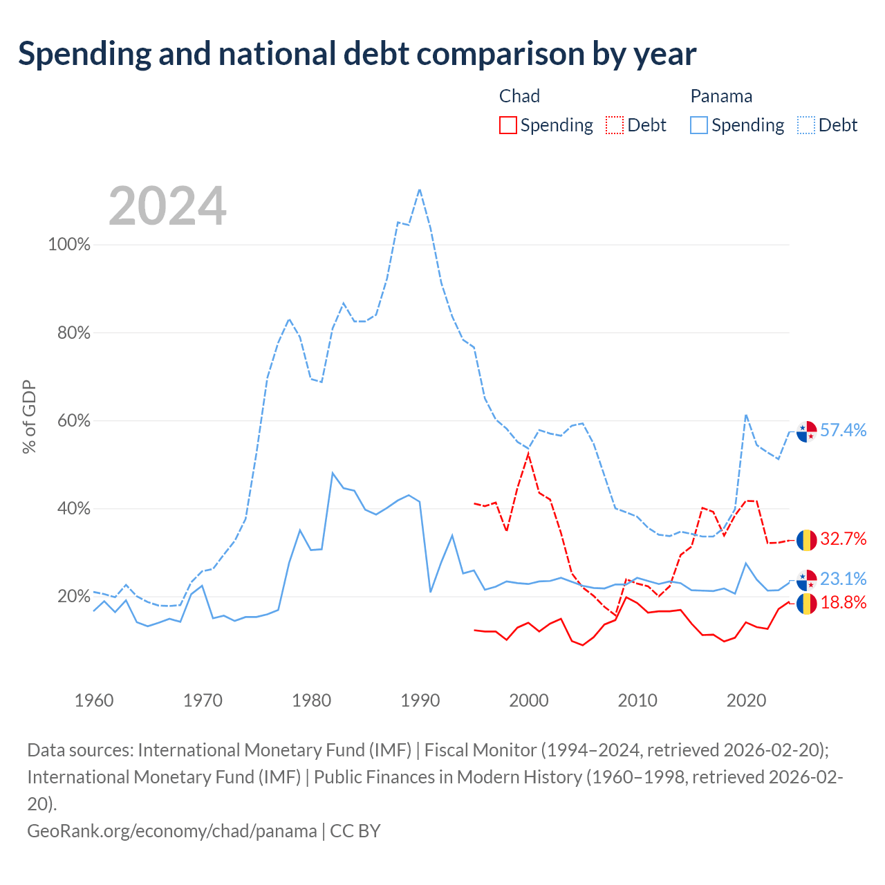Chad has $6.37B in government debt (32.7% of GDP), compared to $49.6B (57.4% of GDP) in Panama.