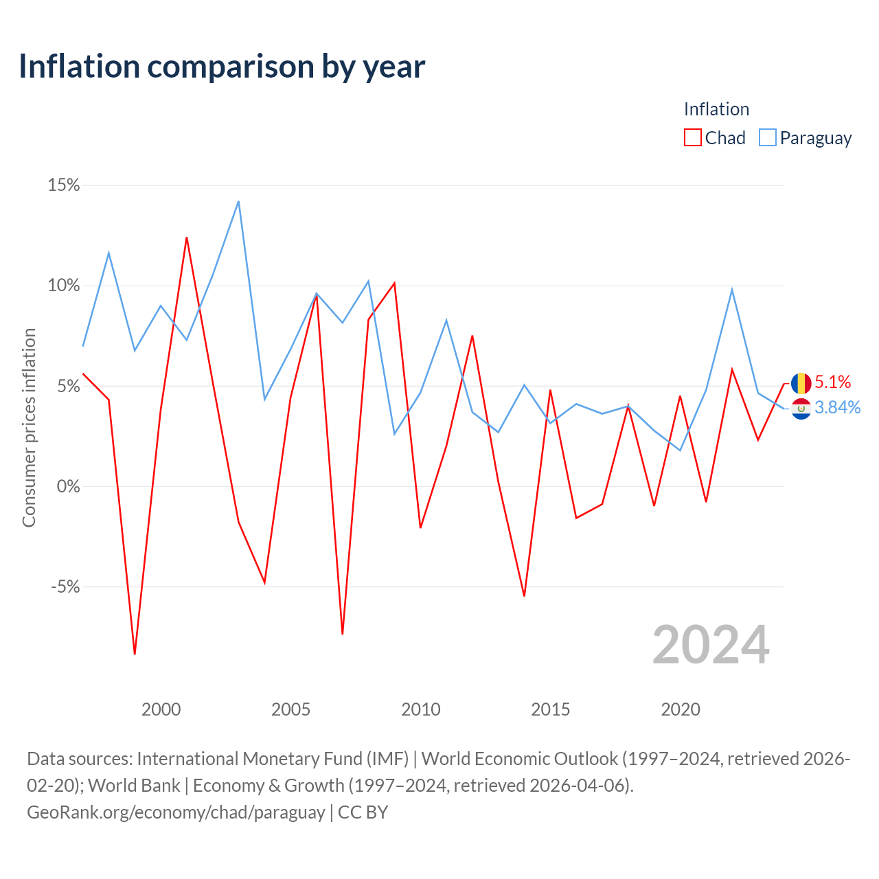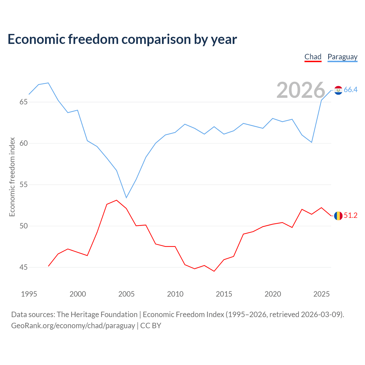 The Economic Freedom Index for Chad is 51.2, ranking 154/197, compared to 66.4 for Paraguay, ranking 61/197. The chart above displays a comparison of annual changes in economic freedom indexes.
