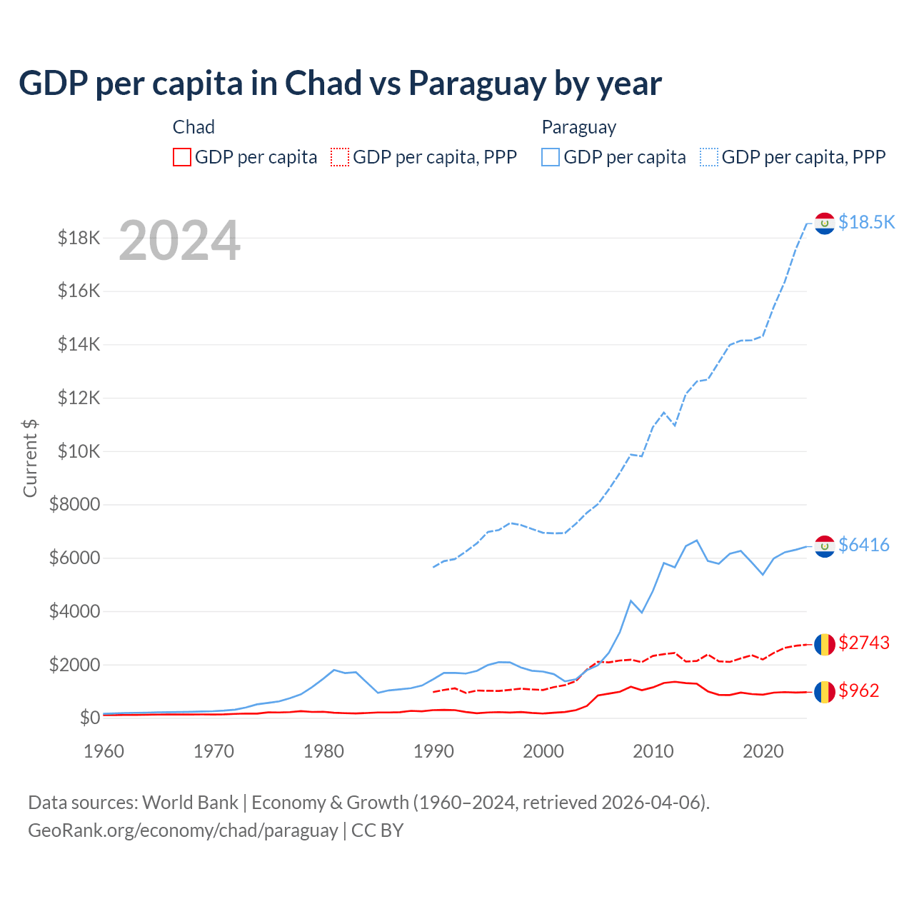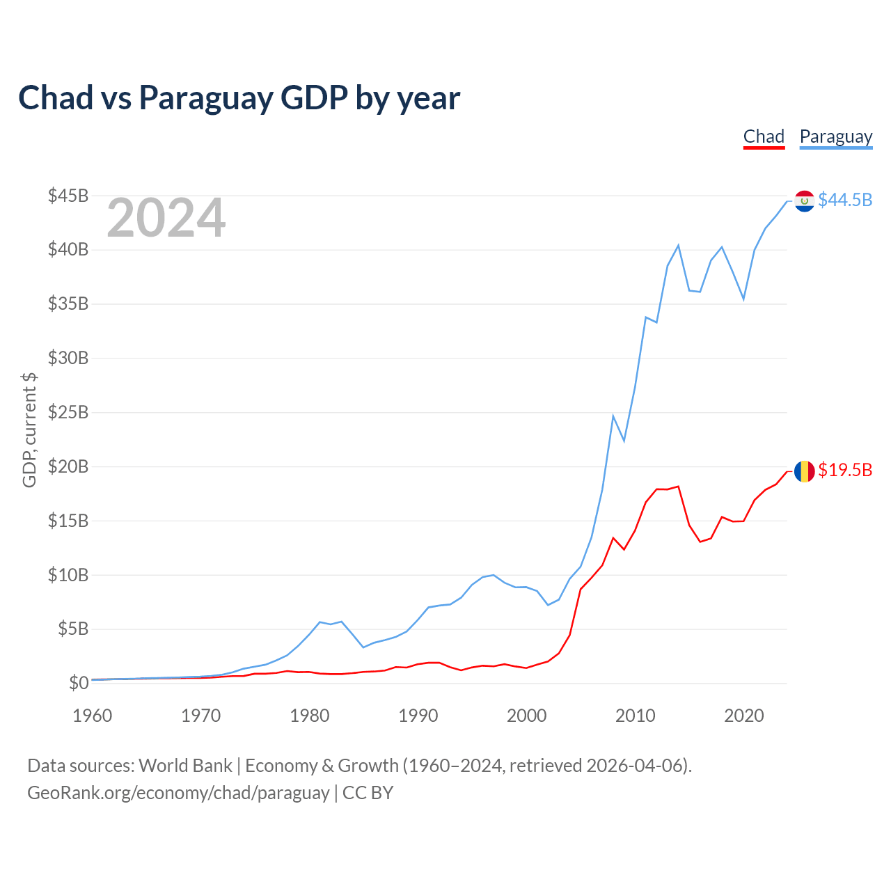 Chad has a GDP of $19.5B compared to $44.5B for Paraguay, ranking 132/197 and 98/197 by economy size, respectively.