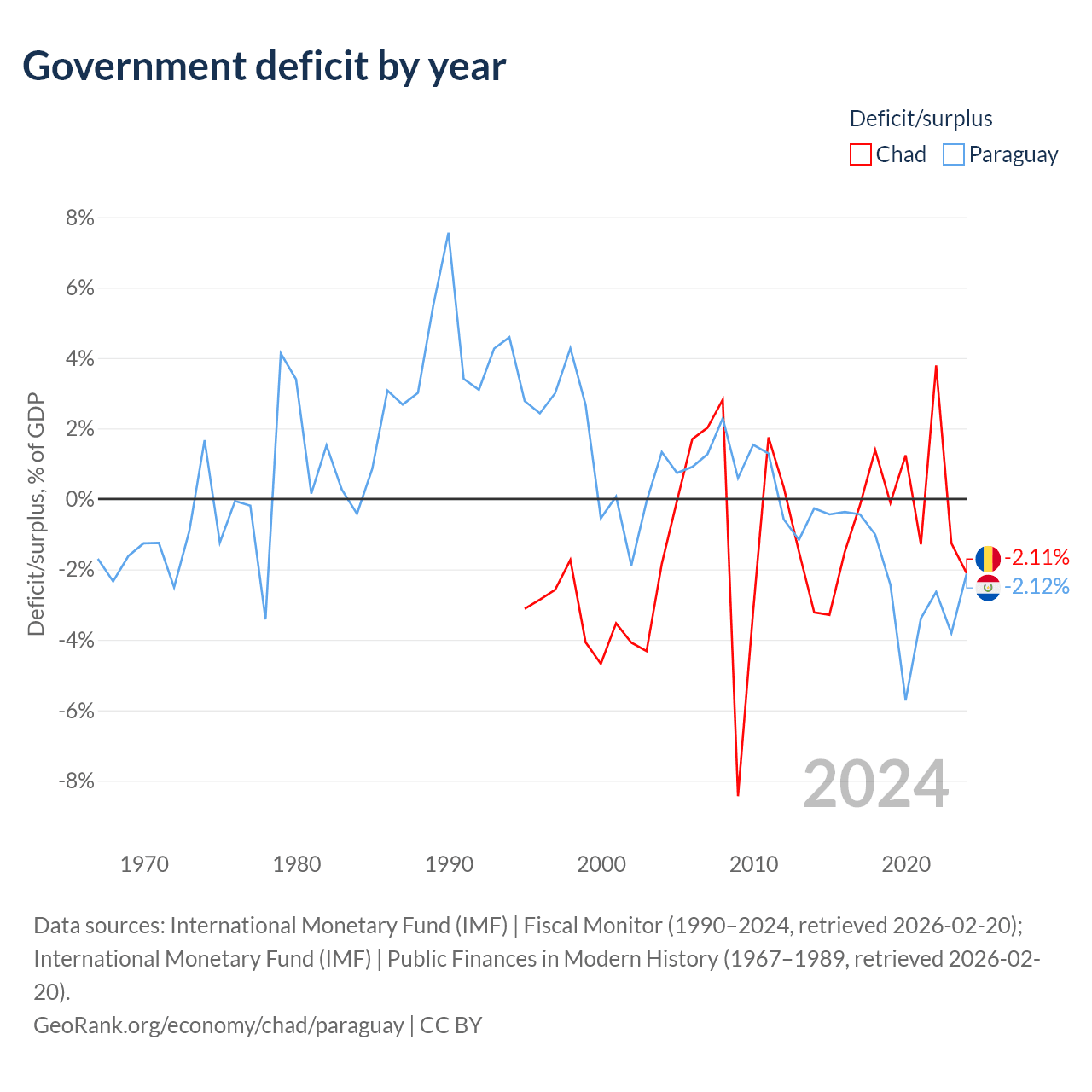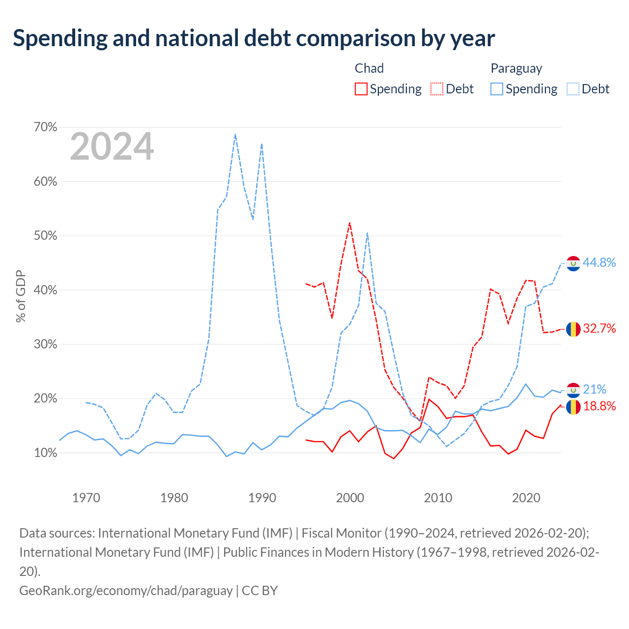 Chad has $6.37B in government debt (32.7% of GDP), compared to $19.9B (44.8% of GDP) in Paraguay.