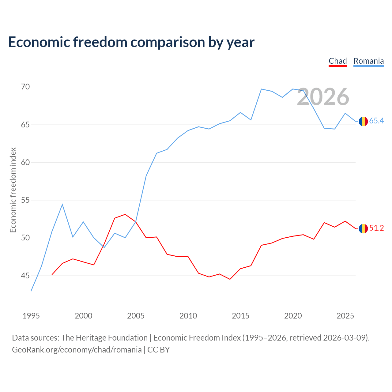 The Economic Freedom Index for Chad is 51.2, ranking 154/197, compared to 65.4 for Romania, ranking 64/197. The chart above displays a comparison of annual changes in economic freedom indexes.