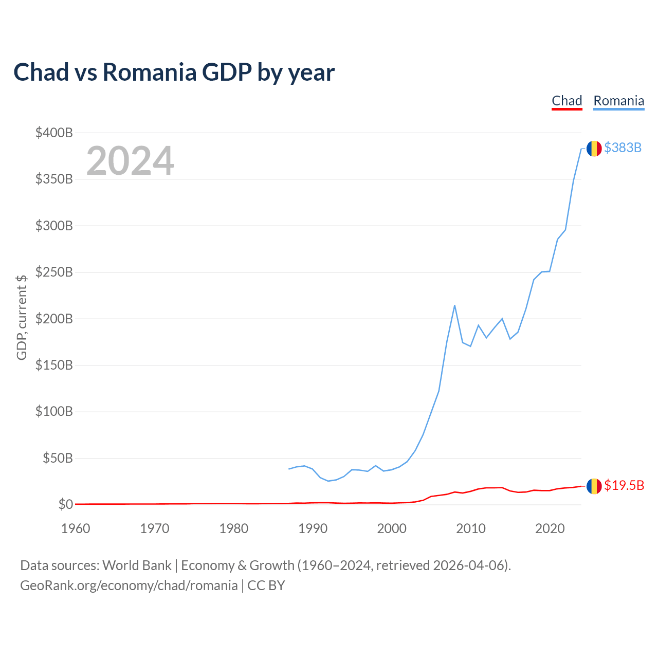 Chad has a GDP of $19.5B compared to $383B for Romania, ranking 132/197 and 42/197 by economy size, respectively.