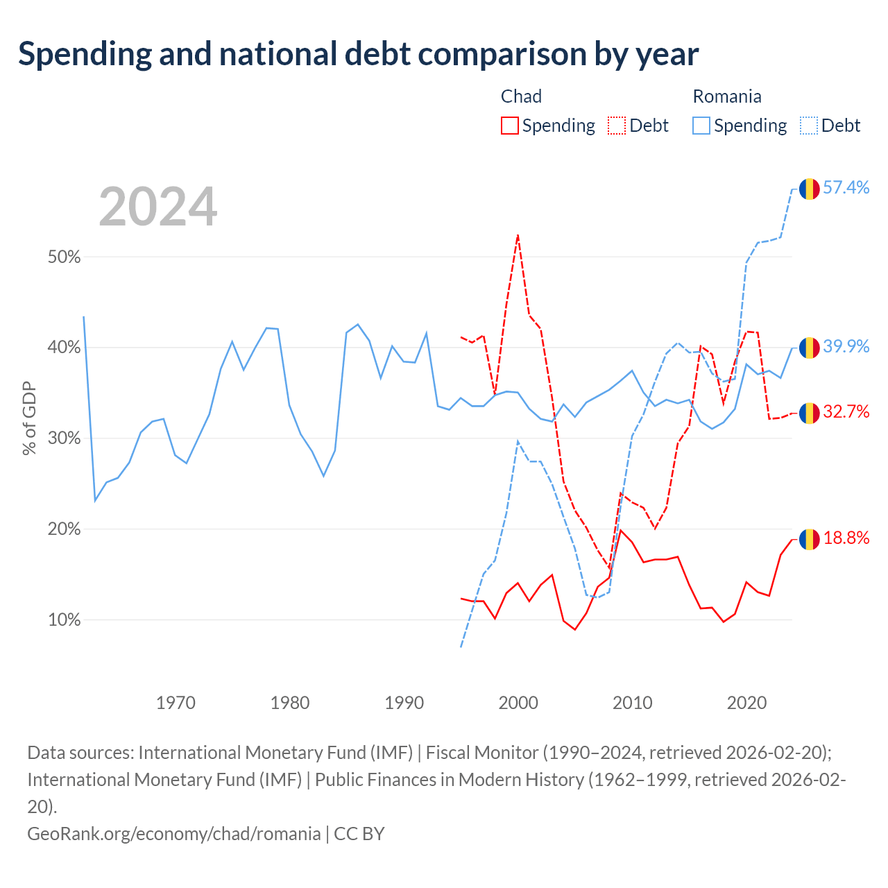Chad has $6.37B in government debt (32.7% of GDP), compared to $220B (57.4% of GDP) in Romania.