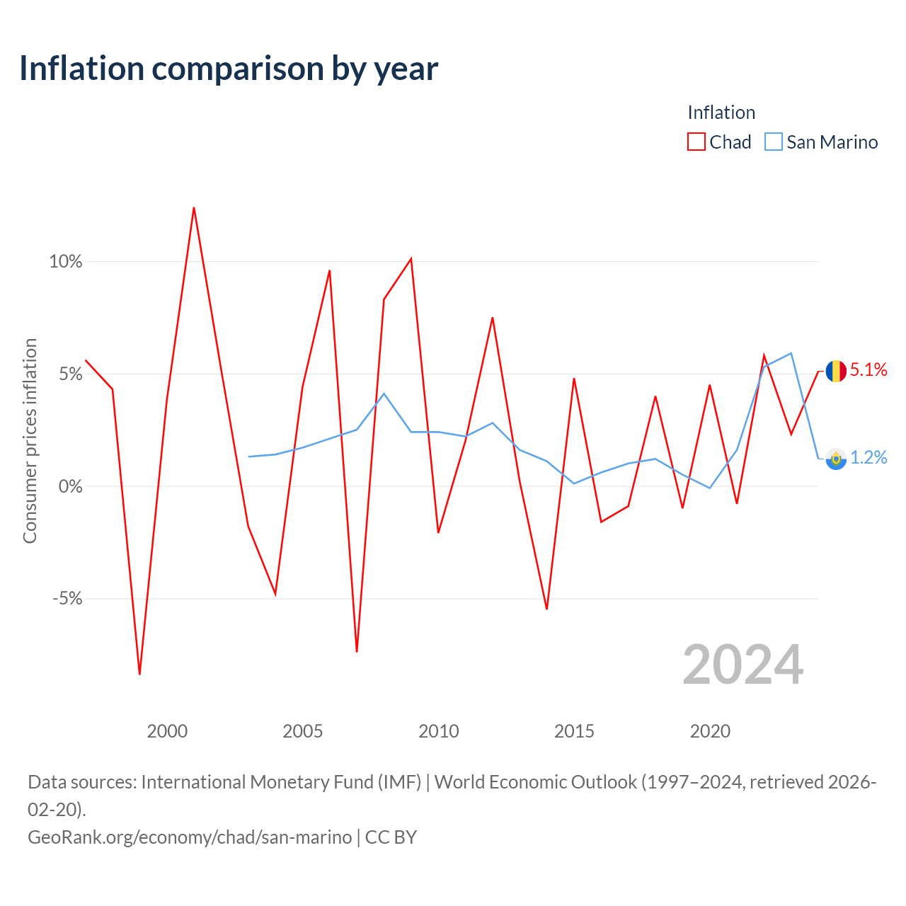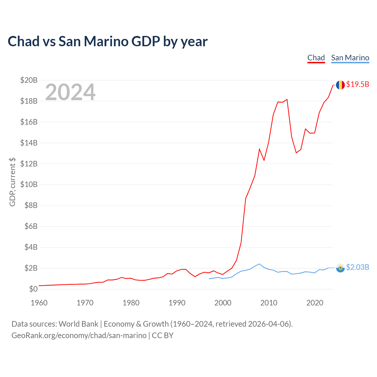 Chad has a GDP of $19.5B compared to $2.03B for San Marino, ranking 132/197 and 180/197 by economy size, respectively.