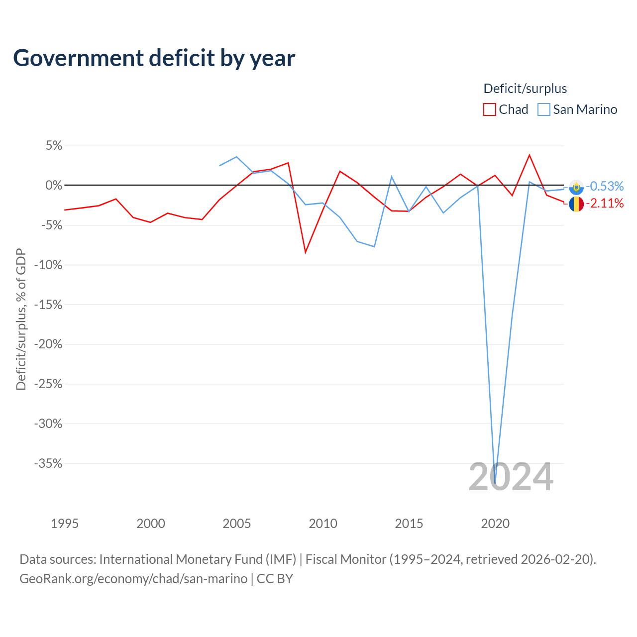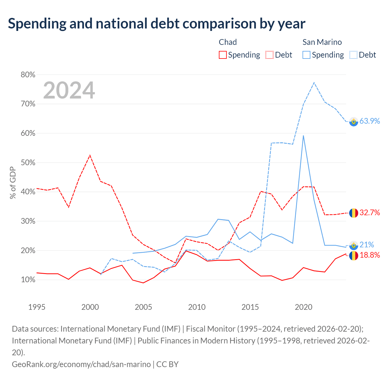 Chad has $6.37B in government debt (32.7% of GDP), compared to $1.39B (63.9% of GDP) in San Marino.