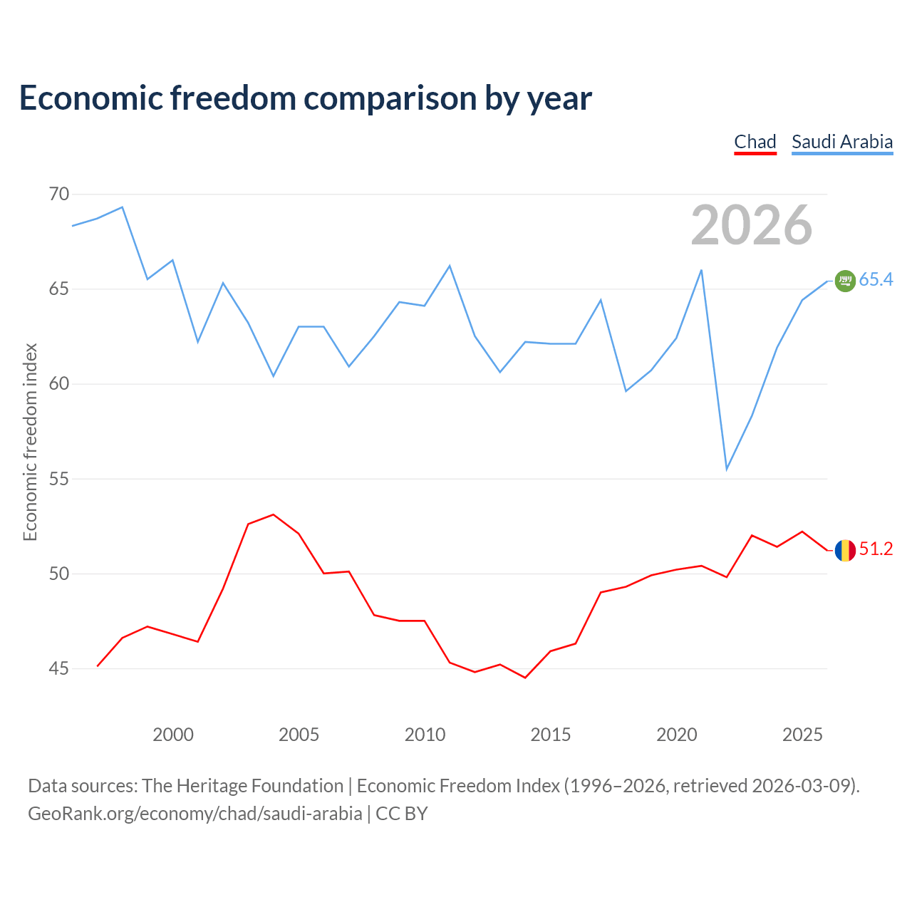 The Economic Freedom Index for Chad is 51.2, ranking 154/197, compared to 65.4 for Saudi Arabia, ranking 65/197. The chart above displays a comparison of annual changes in economic freedom indexes.
