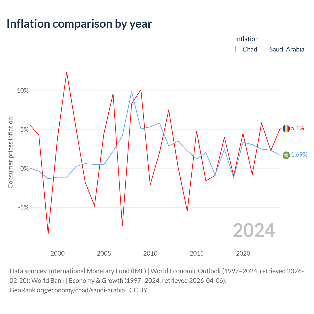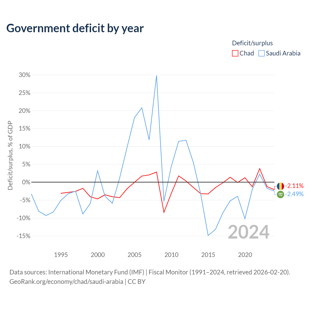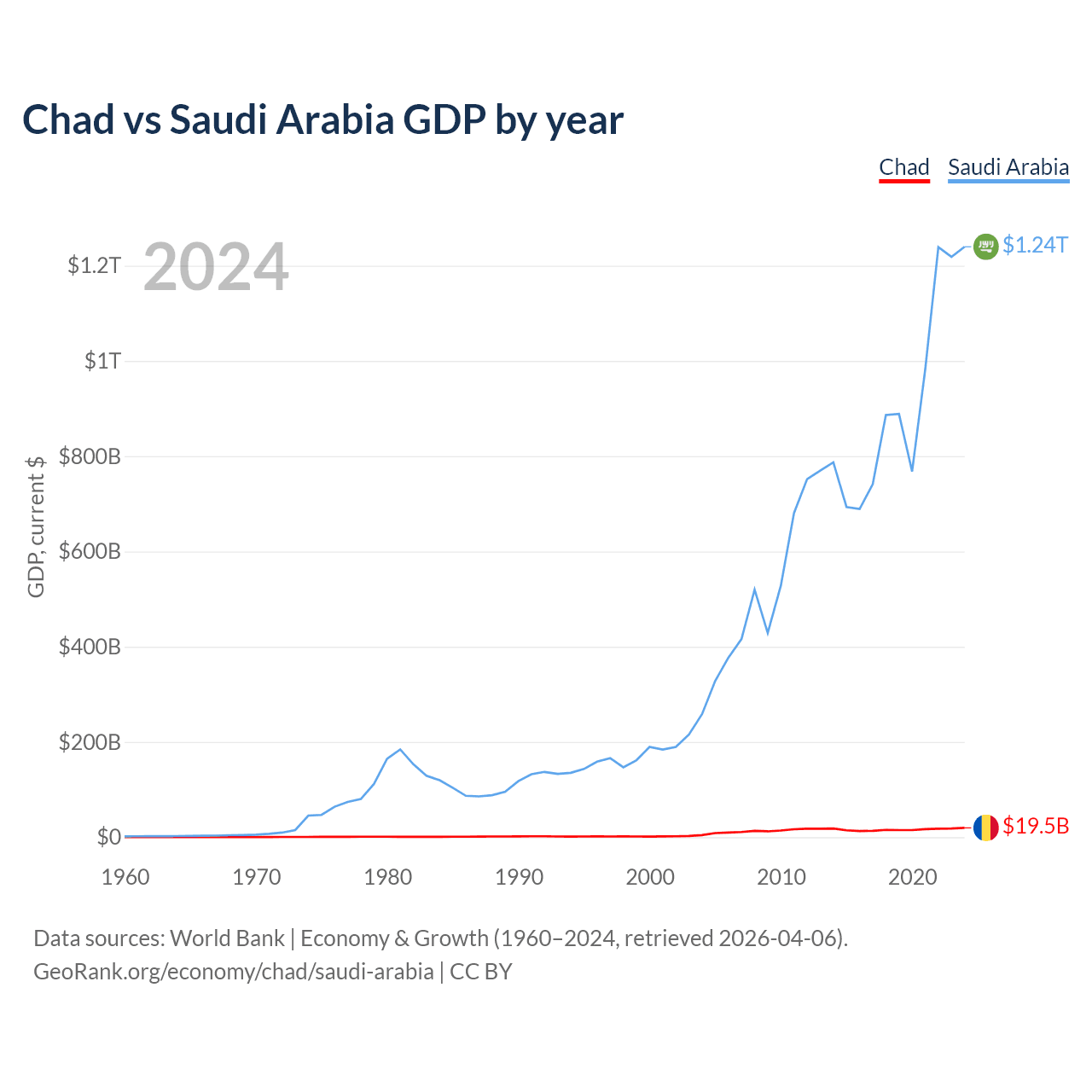Chad has a GDP of $19.5B compared to $1.24T for Saudi Arabia, ranking 132/197 and 18/197 by economy size, respectively.