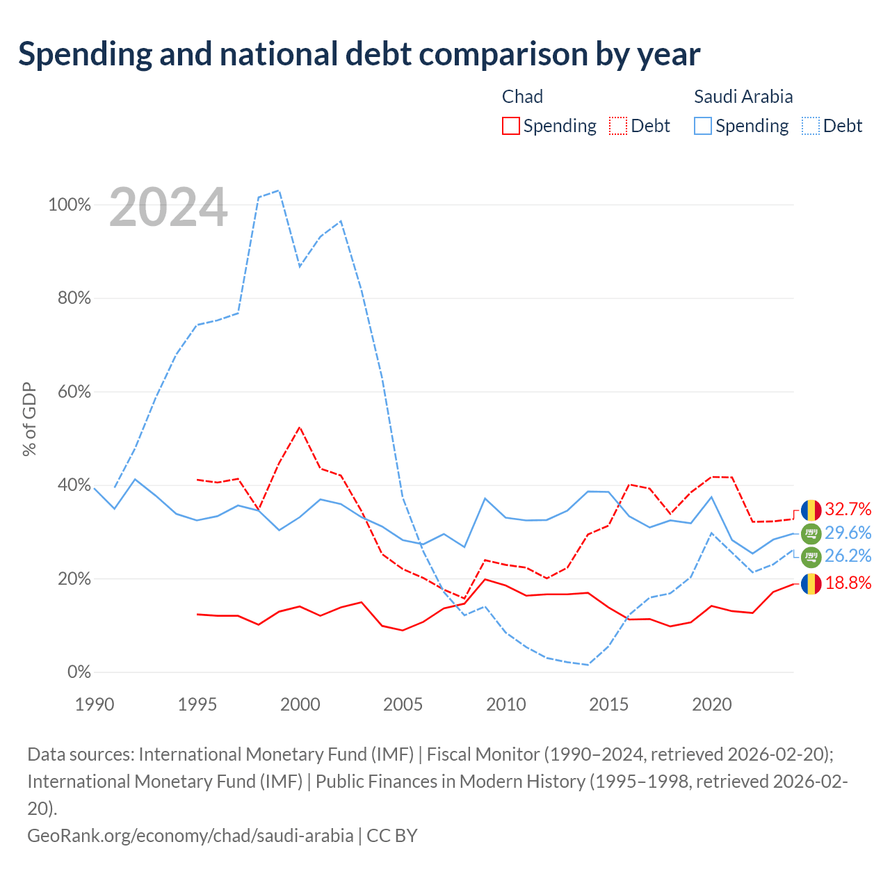 Chad has $6.37B in government debt (32.7% of GDP), compared to $324B (26.2% of GDP) in Saudi Arabia.