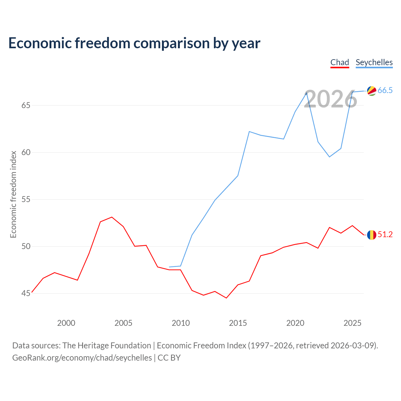 The Economic Freedom Index for Chad is 51.2, ranking 154/197, compared to 66.5 for the Seychelles, ranking 60/197. The chart above displays a comparison of annual changes in economic freedom indexes.