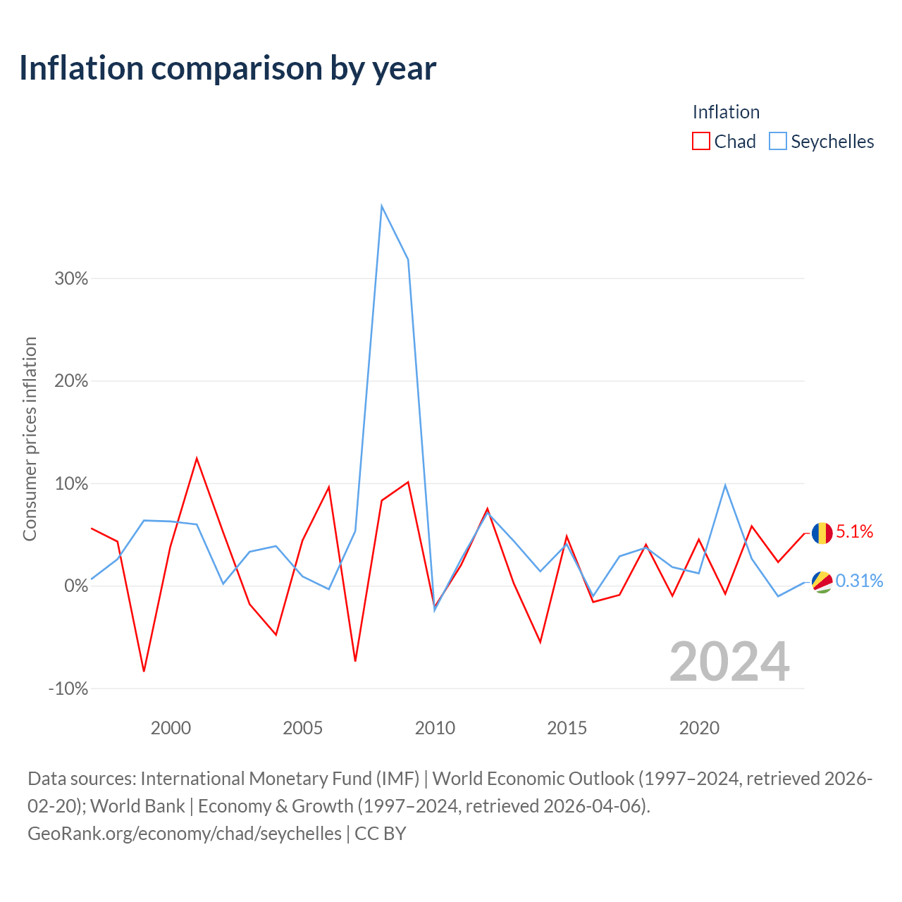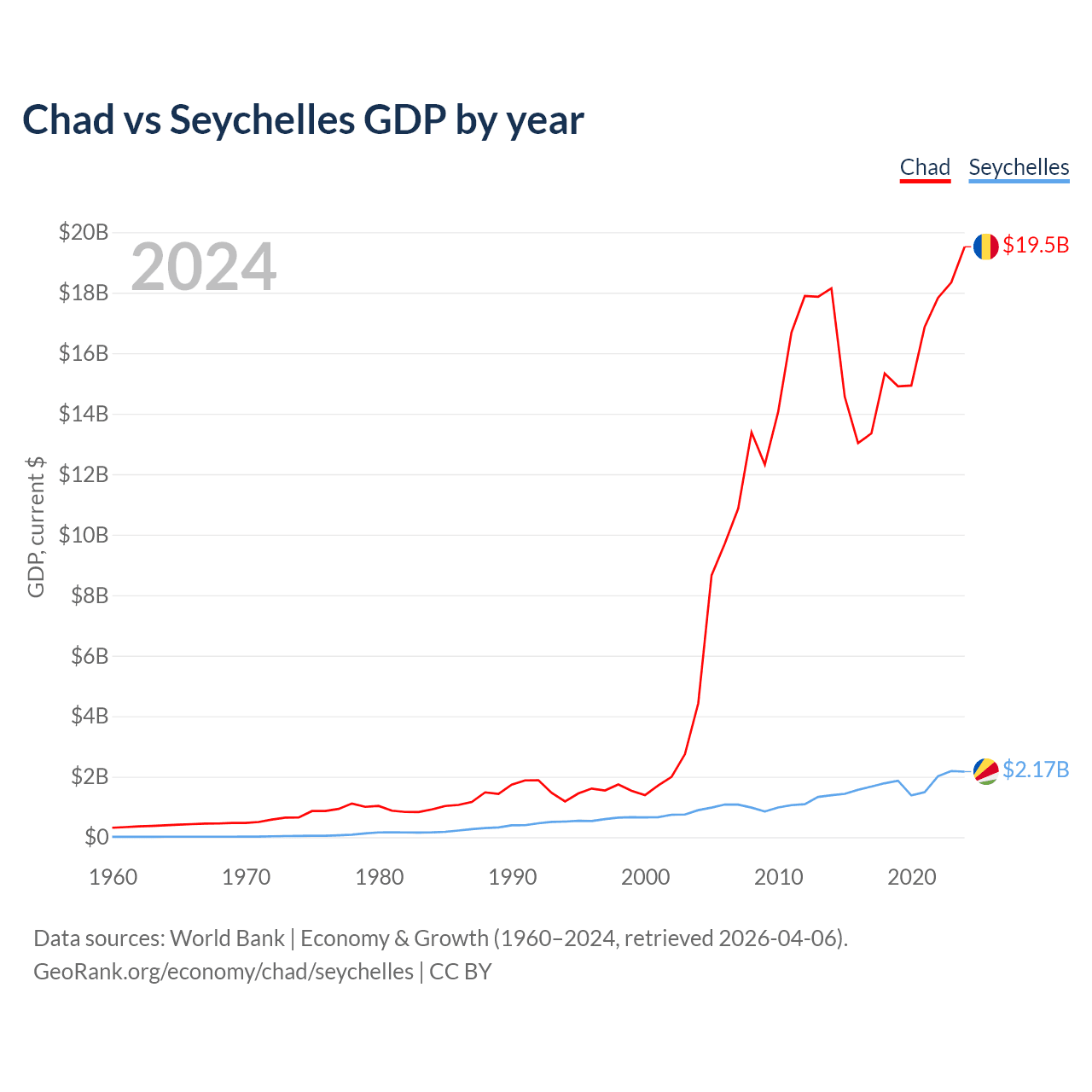 Chad has a GDP of $19.5B compared to $2.17B for the Seychelles, ranking 132/197 and 178/197 by economy size, respectively.