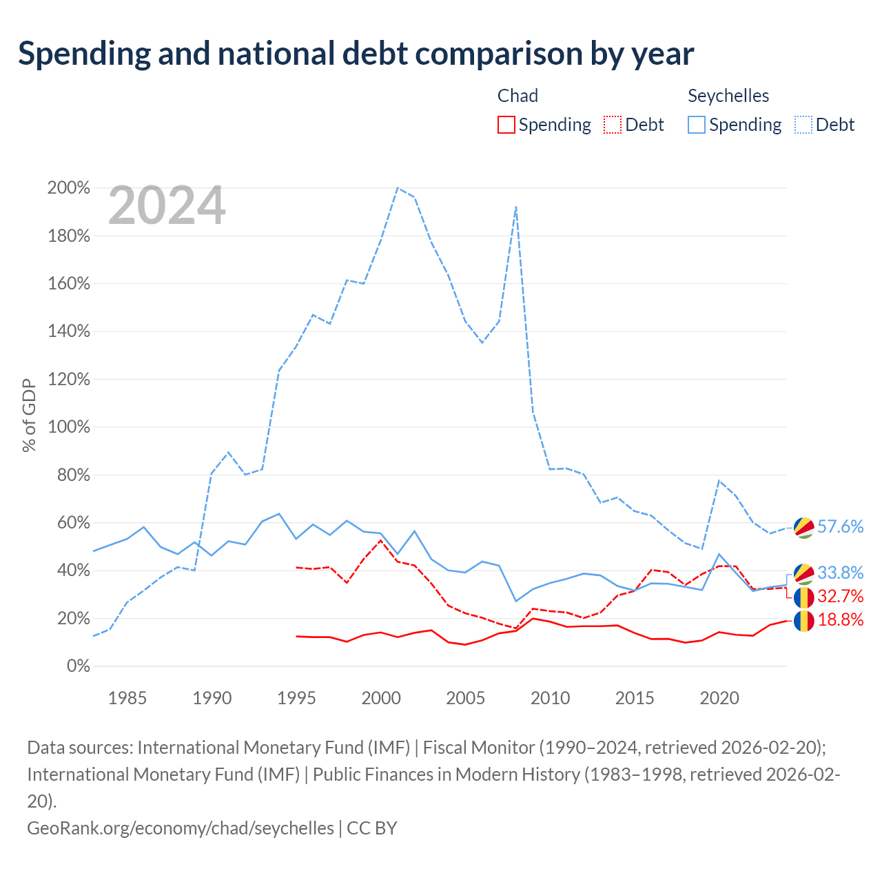 Chad has $6.37B in government debt (32.7% of GDP), compared to $1.25B (57.6% of GDP) in the Seychelles.
