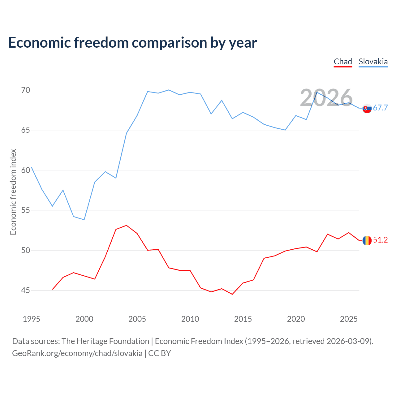 The Economic Freedom Index for Chad is 51.2, ranking 154/197, compared to 67.7 for Slovakia, ranking 54/197. The chart above displays a comparison of annual changes in economic freedom indexes.