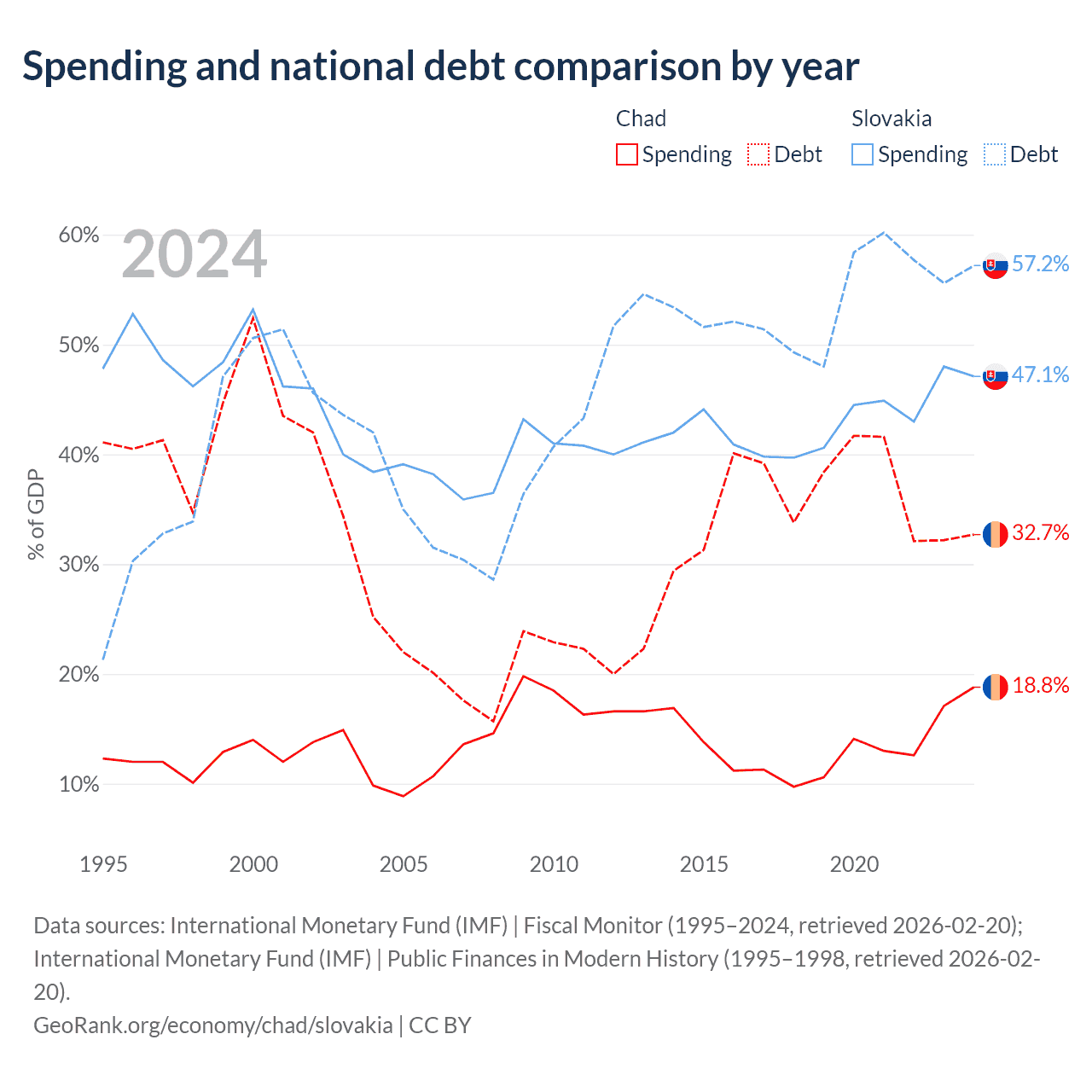 Chad has $6.37B in government debt (32.7% of GDP), compared to $80.7B (57.2% of GDP) in Slovakia.