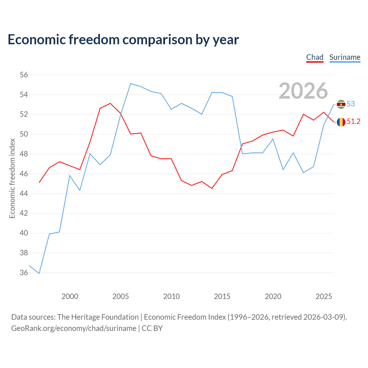 The Economic Freedom Index for Chad is 51.2, ranking 154/197, compared to 53 for Suriname, ranking 143/197. The chart above displays a comparison of annual changes in economic freedom indexes.