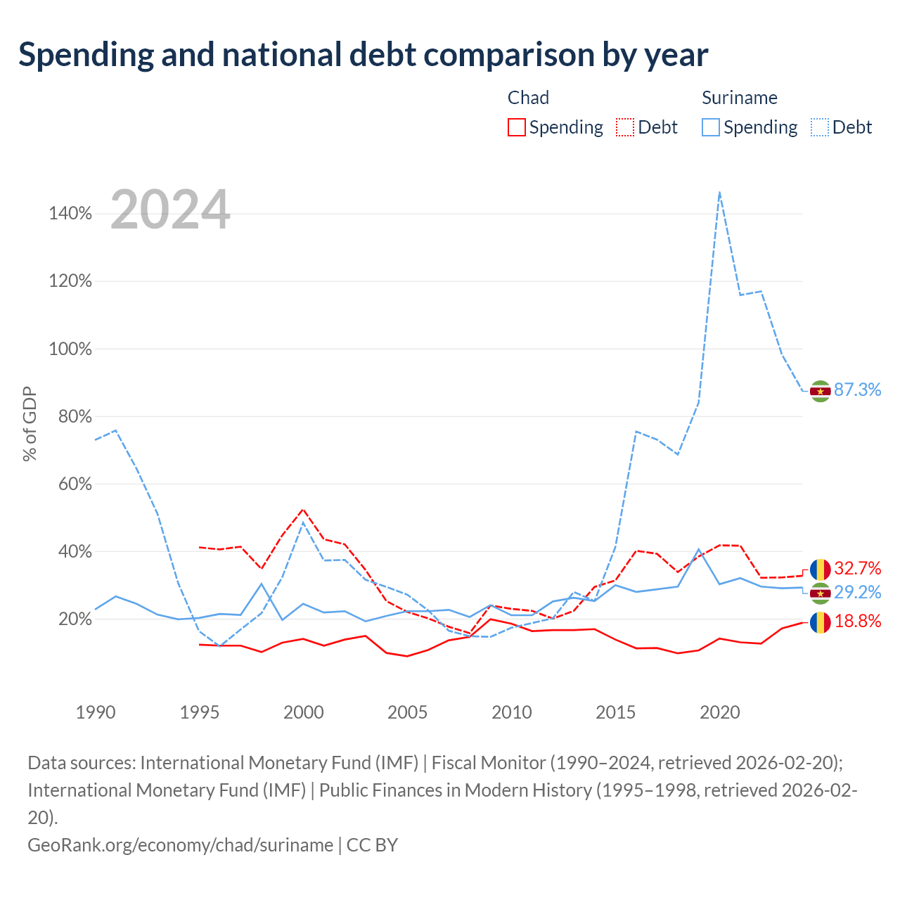 Chad has $6.37B in government debt (32.7% of GDP), compared to $3.86B (87.3% of GDP) in Suriname.