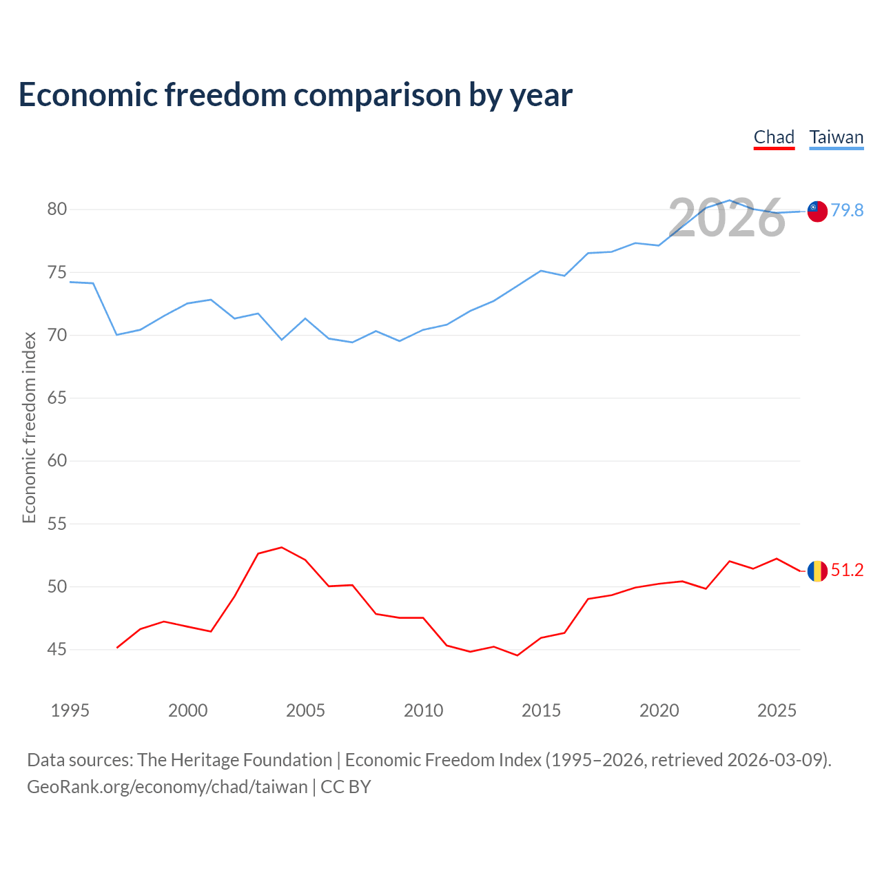 The Economic Freedom Index for Chad is 51.2, ranking 154/197, compared to 79.8 for Taiwan, ranking 6/197. The chart above displays a comparison of annual changes in economic freedom indexes.