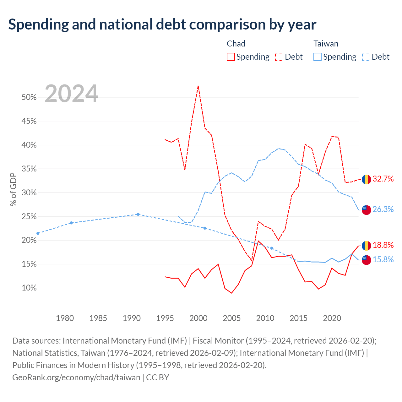 Chad has $6.37B in government debt (32.7% of GDP), compared to $211B (26.3% of GDP) in Taiwan.