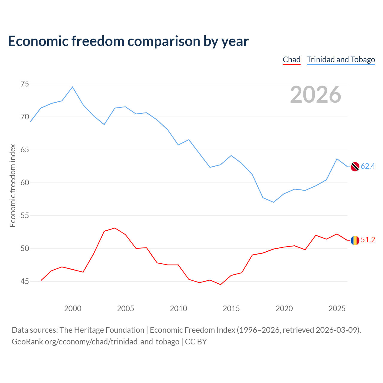The Economic Freedom Index for Chad is 51.2, ranking 154/197, compared to 62.4 for Trinidad and Tobago, ranking 87/197. The chart above displays a comparison of annual changes in economic freedom indexes.