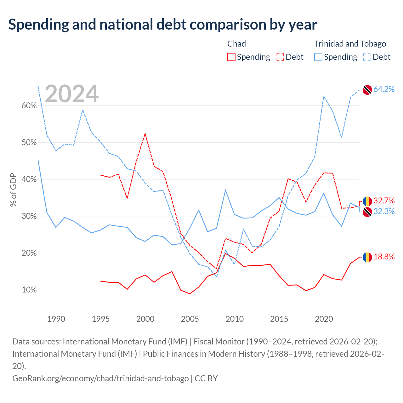 Chad has $6.37B in government debt (32.7% of GDP), compared to $16.5B (64.2% of GDP) in Trinidad and Tobago.