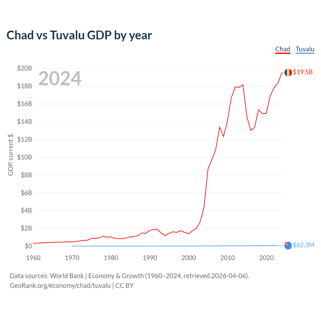 Chad has a GDP of $19.5B compared to $62.3M for Tuvalu, ranking 132/197 and 196/197 by economy size, respectively.