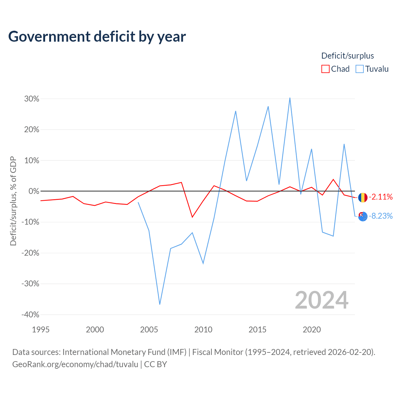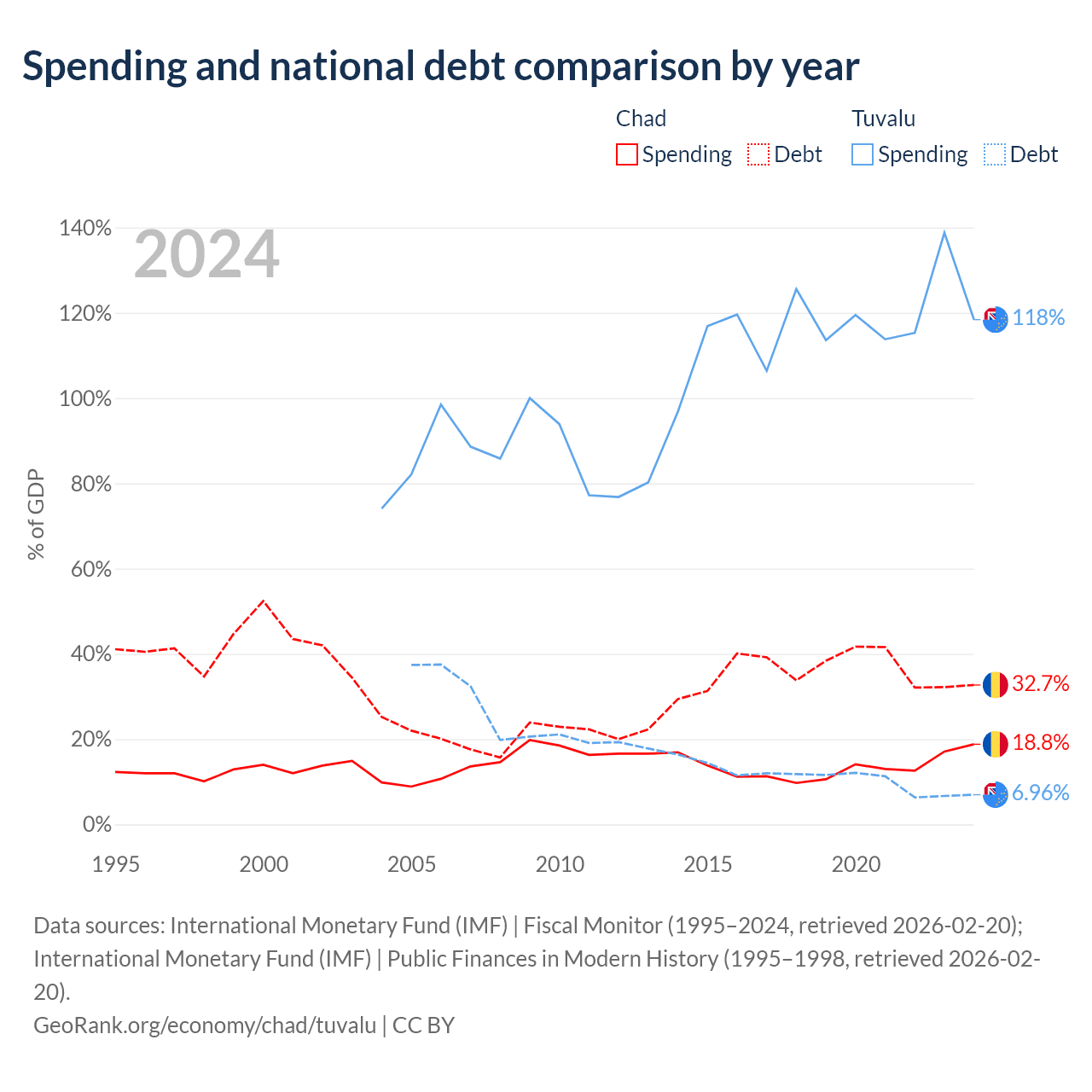 Chad has $6.37B in government debt (32.7% of GDP), compared to $4.15M (6.96% of GDP) in Tuvalu.