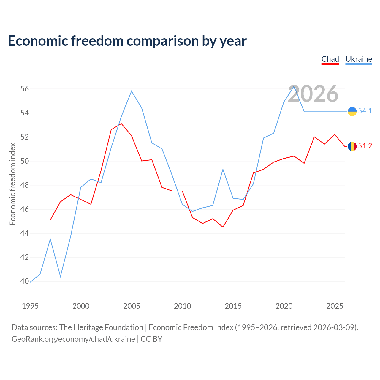 The Economic Freedom Index for Chad is 51.2, ranking 154/197, compared to 54.1 for Ukraine, ranking 135/197. The chart above displays a comparison of annual changes in economic freedom indexes.
