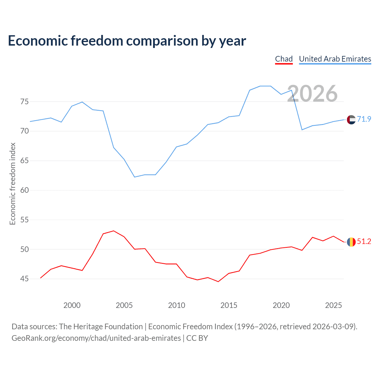 The Economic Freedom Index for Chad is 51.2, ranking 154/197, compared to 71.9 for the United Arab Emirates, ranking 29/197. The chart above displays a comparison of annual changes in economic freedom indexes.