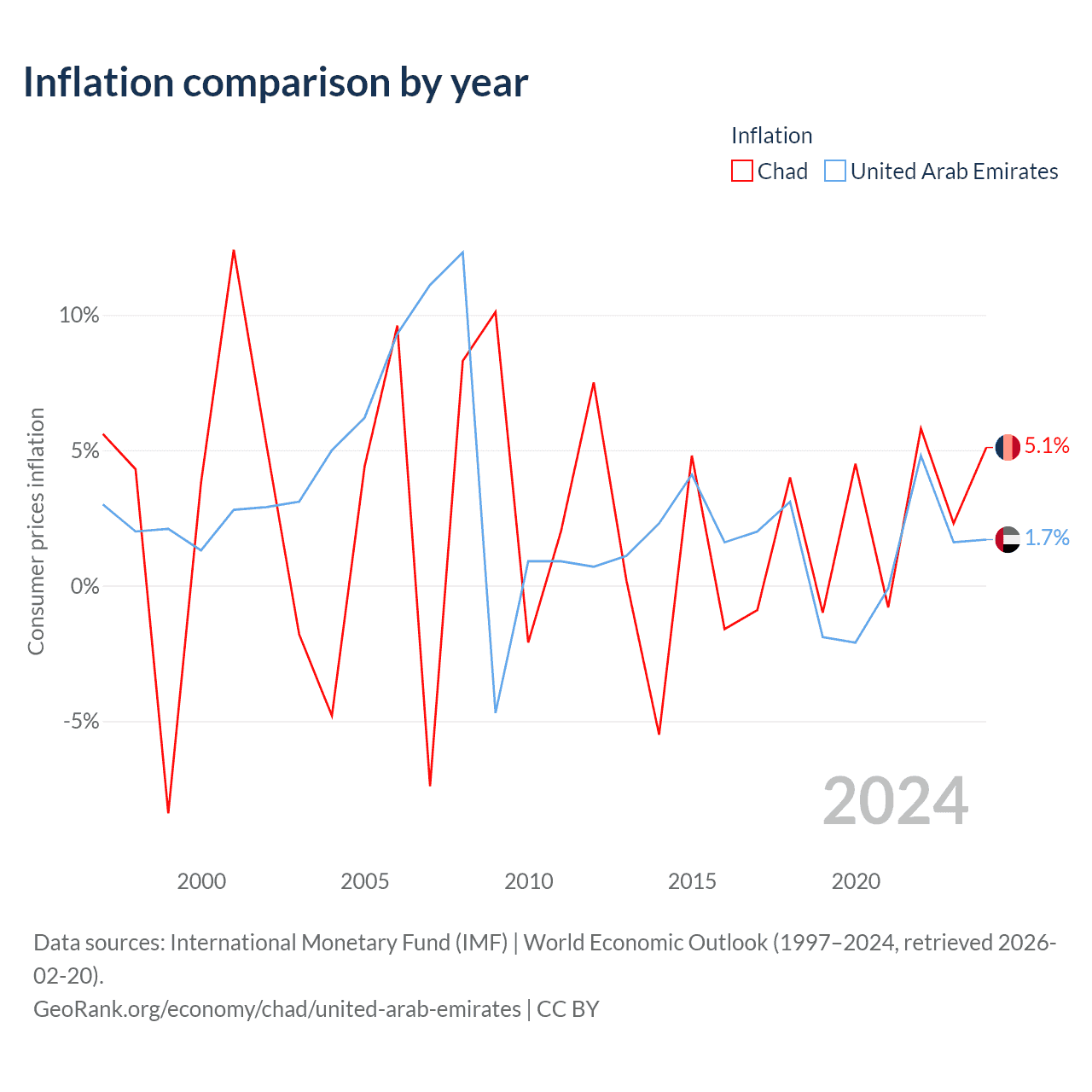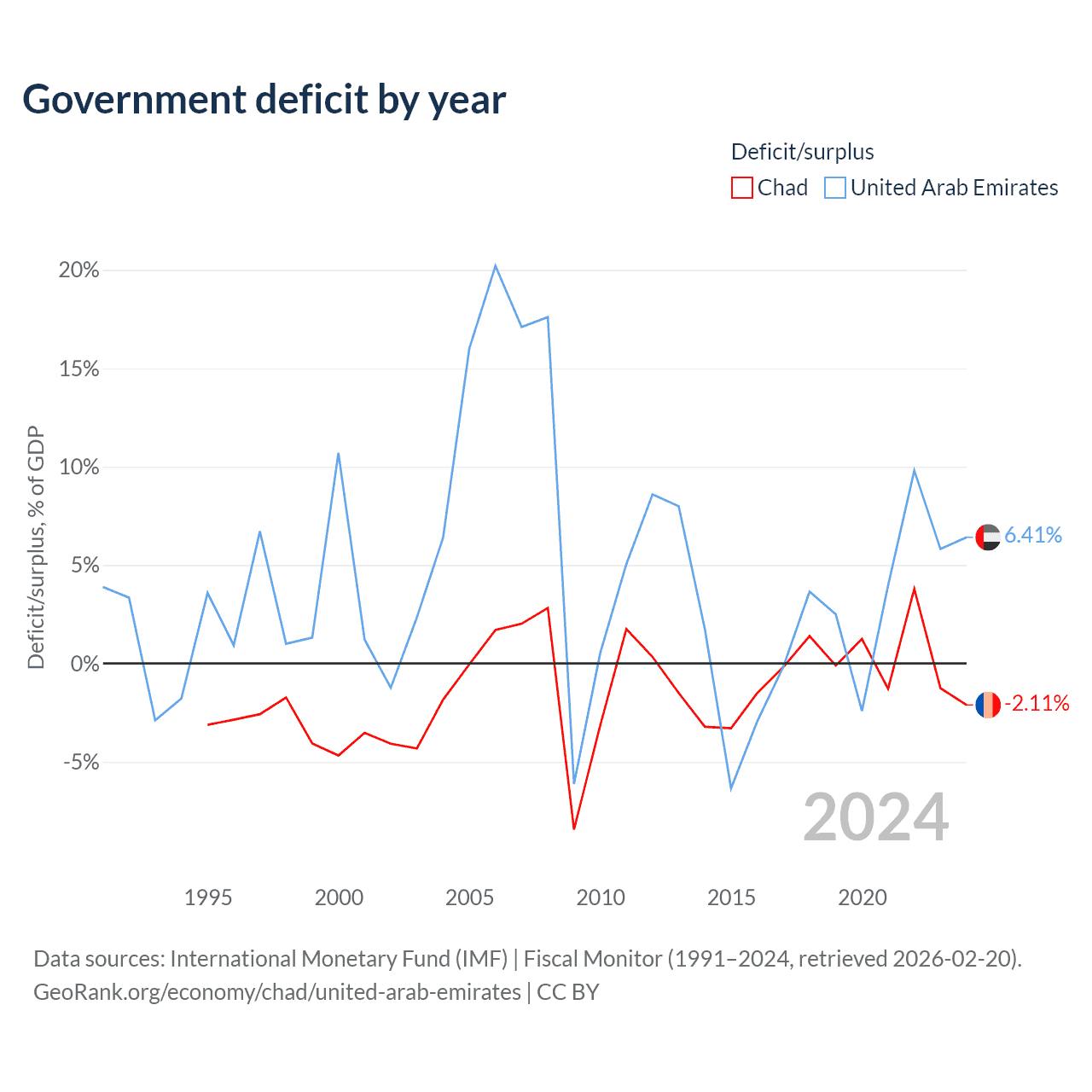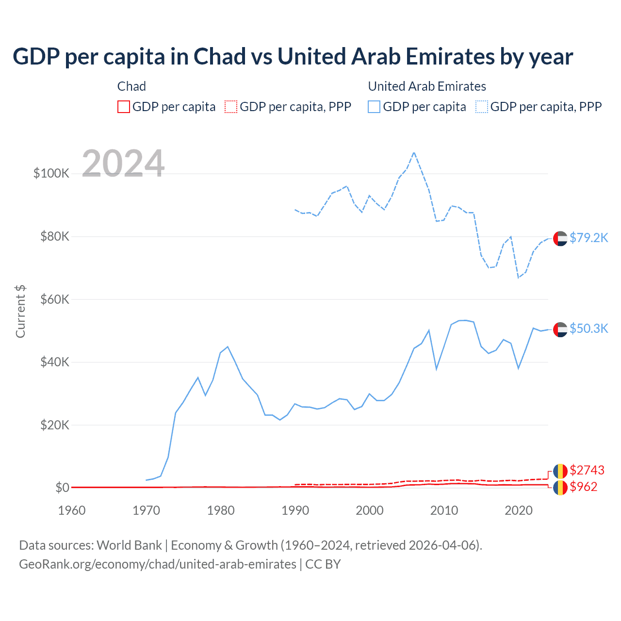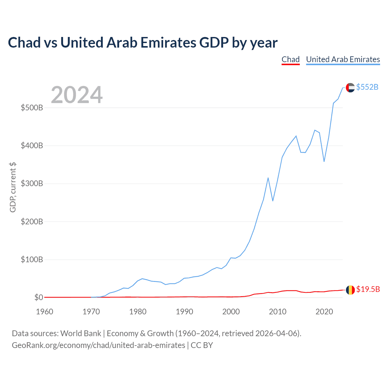 Chad has a GDP of $19.5B compared to $552B for the United Arab Emirates, ranking 132/197 and 27/197 by economy size, respectively.