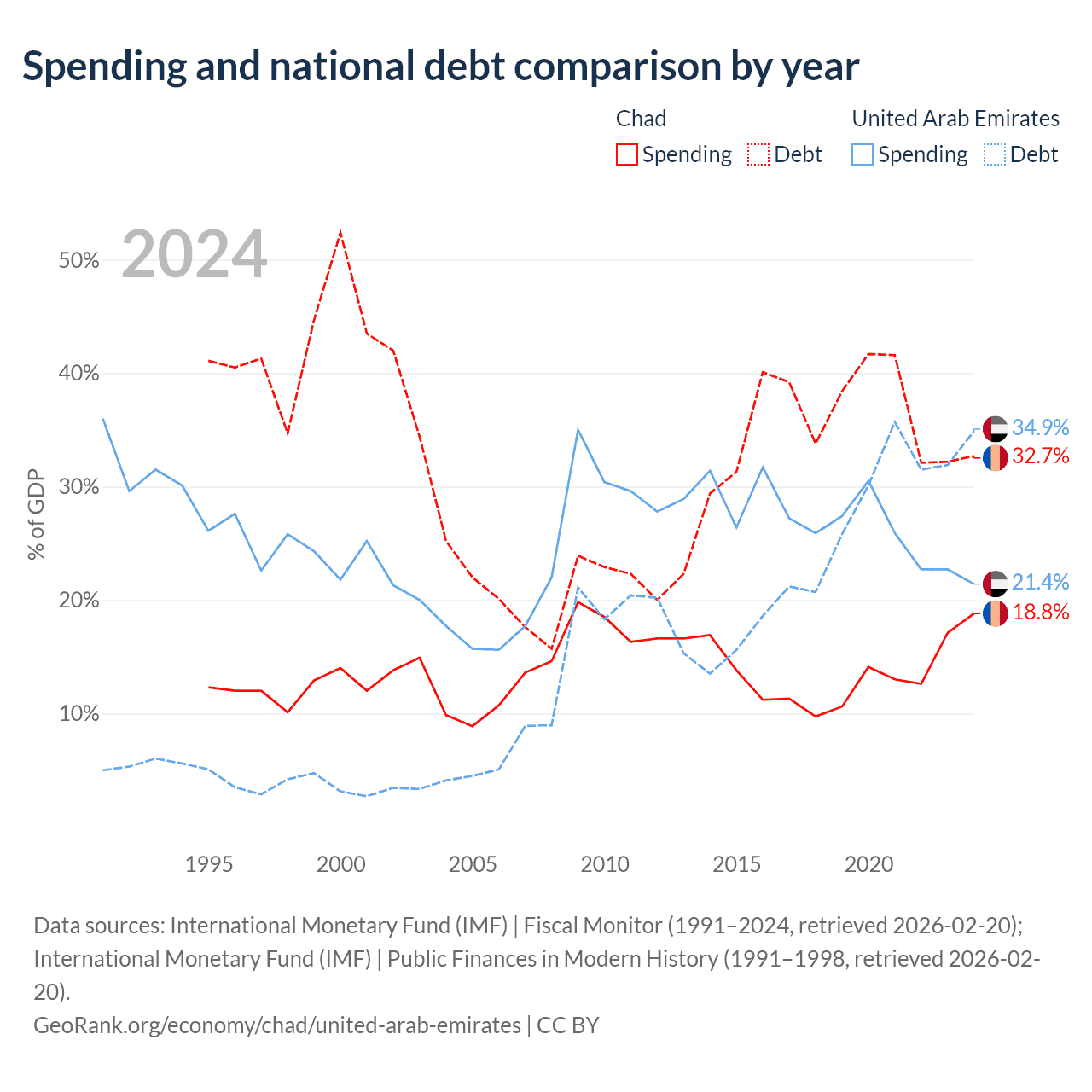 Chad has $6.37B in government debt (32.7% of GDP), compared to $193B (34.9% of GDP) in the United Arab Emirates.
