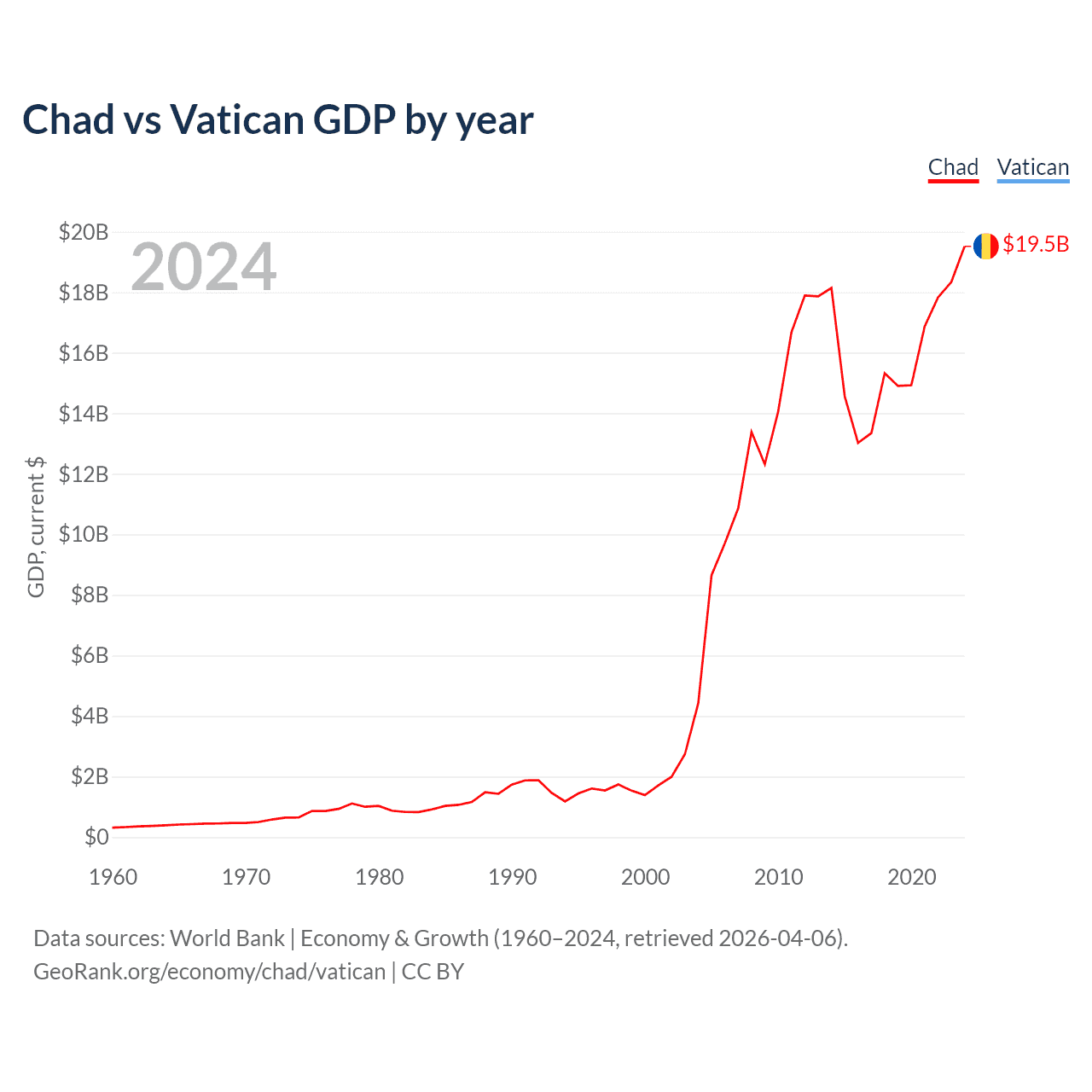 Chad has a GDP of $19.5B compared to $19.8M for the Vatican, ranking 132/197 and 197/197 by economy size, respectively.