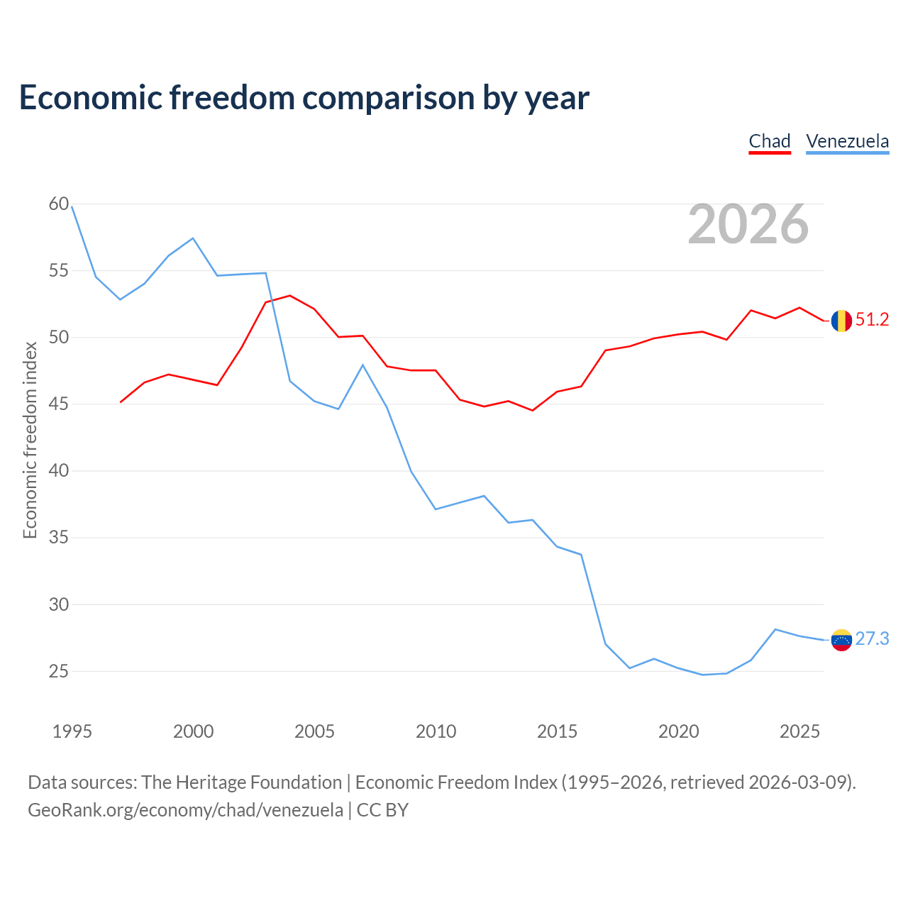 The Economic Freedom Index for Chad is 51.2, ranking 154/197, compared to 27.3 for Venezuela, ranking 194/197. The chart above displays a comparison of annual changes in economic freedom indexes.