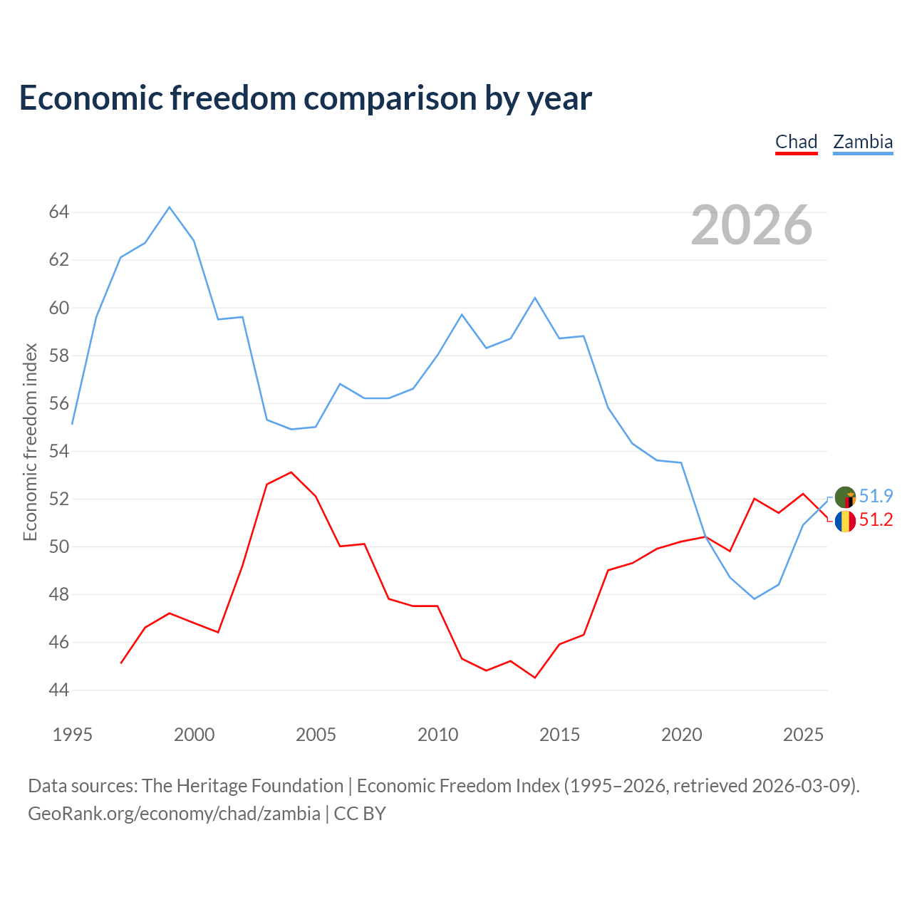 The Economic Freedom Index for Chad is 51.2, ranking 154/197, compared to 51.9 for Zambia, ranking 152/197. The chart above displays a comparison of annual changes in economic freedom indexes.