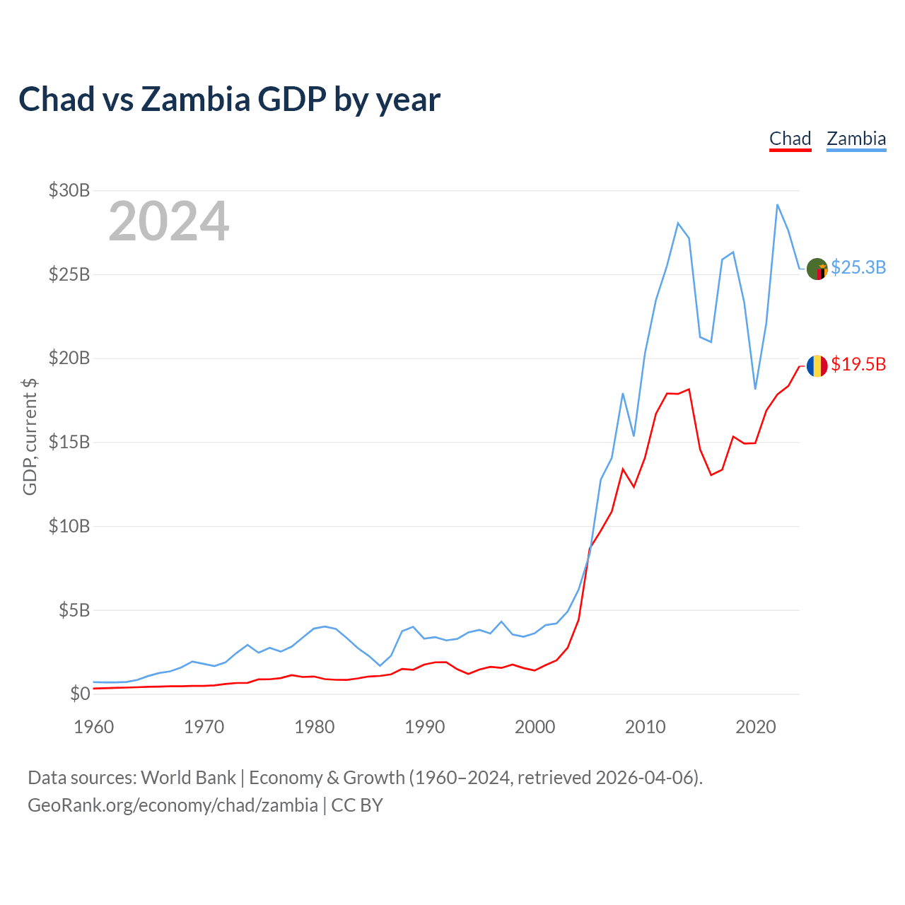 Chad has a GDP of $19.5B compared to $25.3B for Zambia, ranking 132/197 and 116/197 by economy size, respectively.