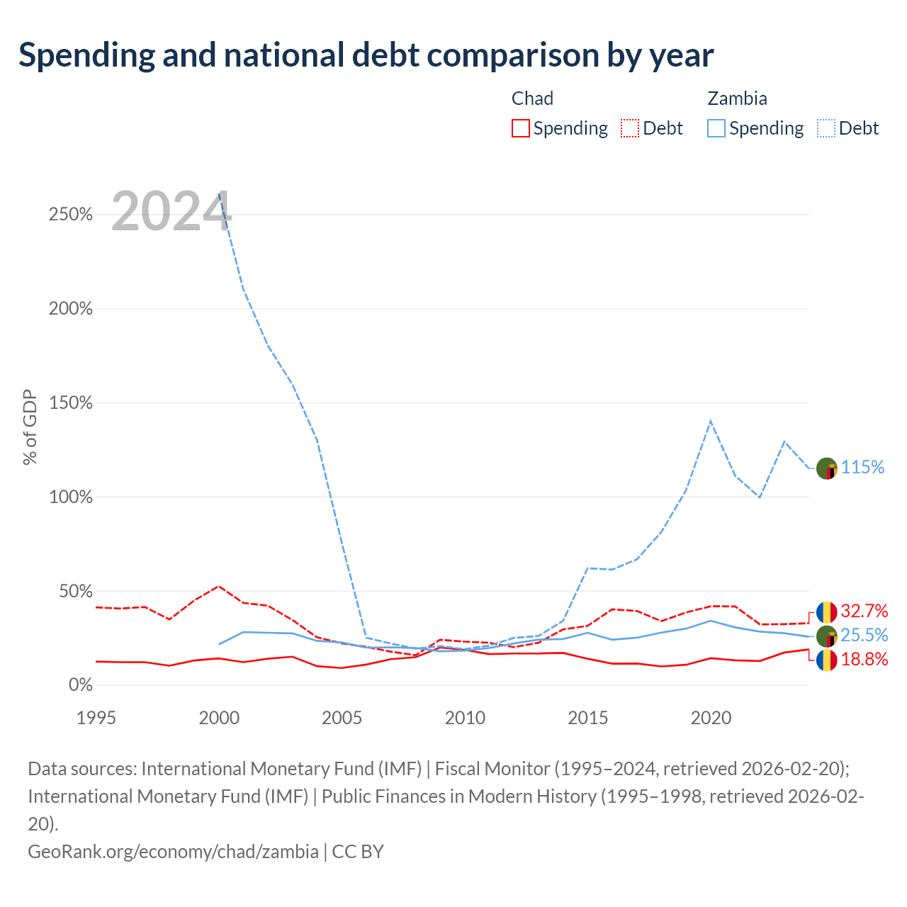 Chad has $6.37B in government debt (32.7% of GDP), compared to $29.1B (114.9% of GDP) in Zambia.